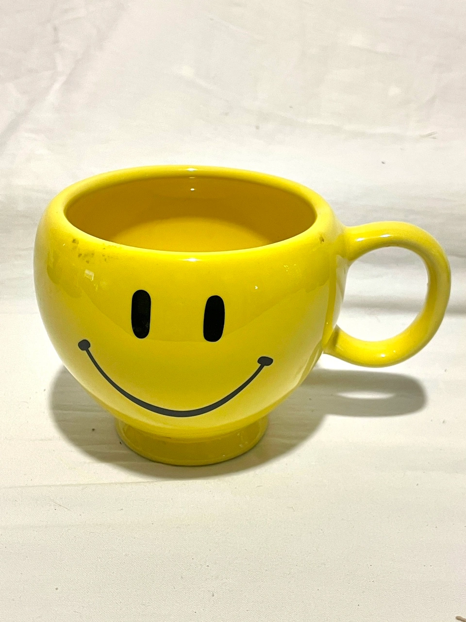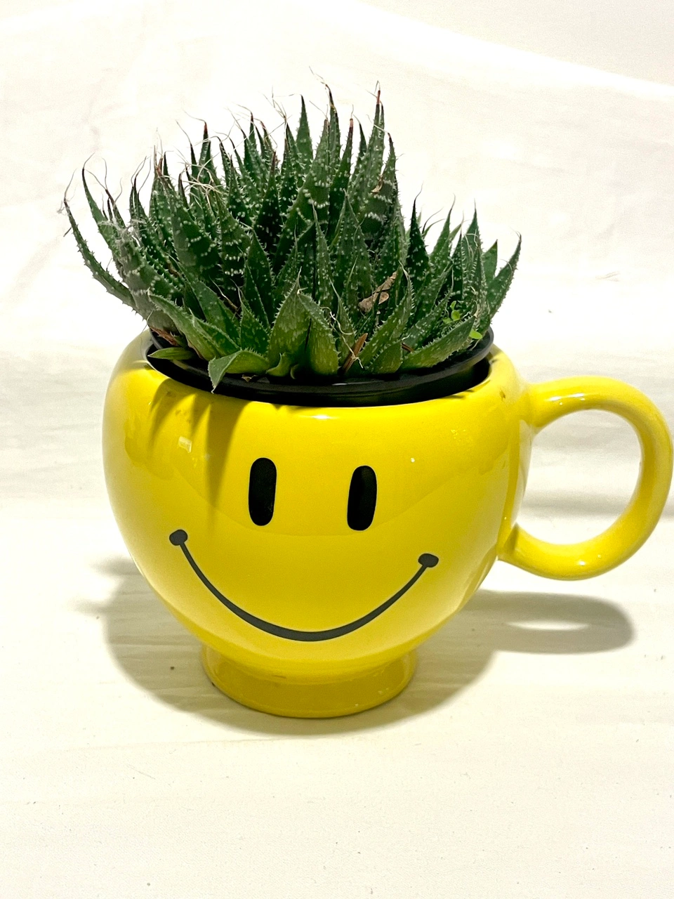 A yellow smiley face planter or pens holder. The planter has a handle and is made of ceramic. Includes plant.