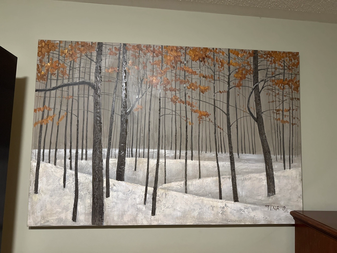 A large canvas painting depicting a forest in the winter. It features a snowy landscape with tall, dark trees and a textured background. The painting is signed in the bottom right corner.