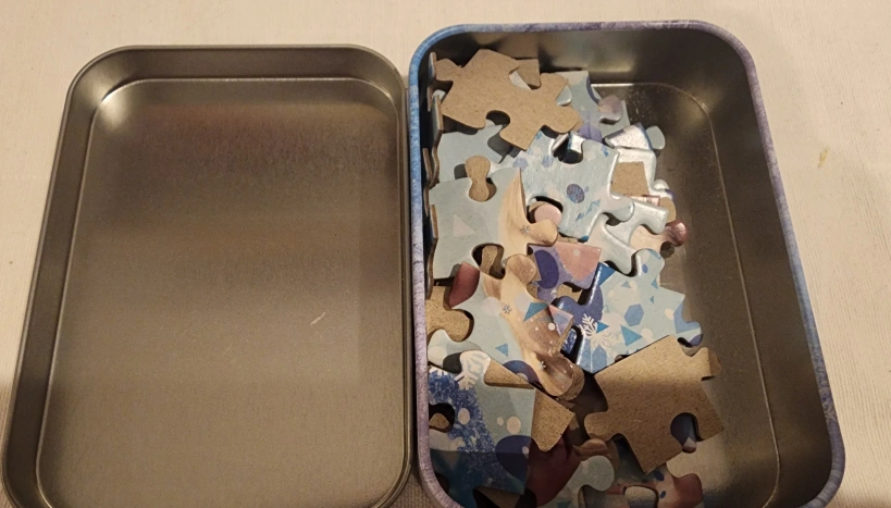 It comes in a tin container with a picture of Elsa on the front.