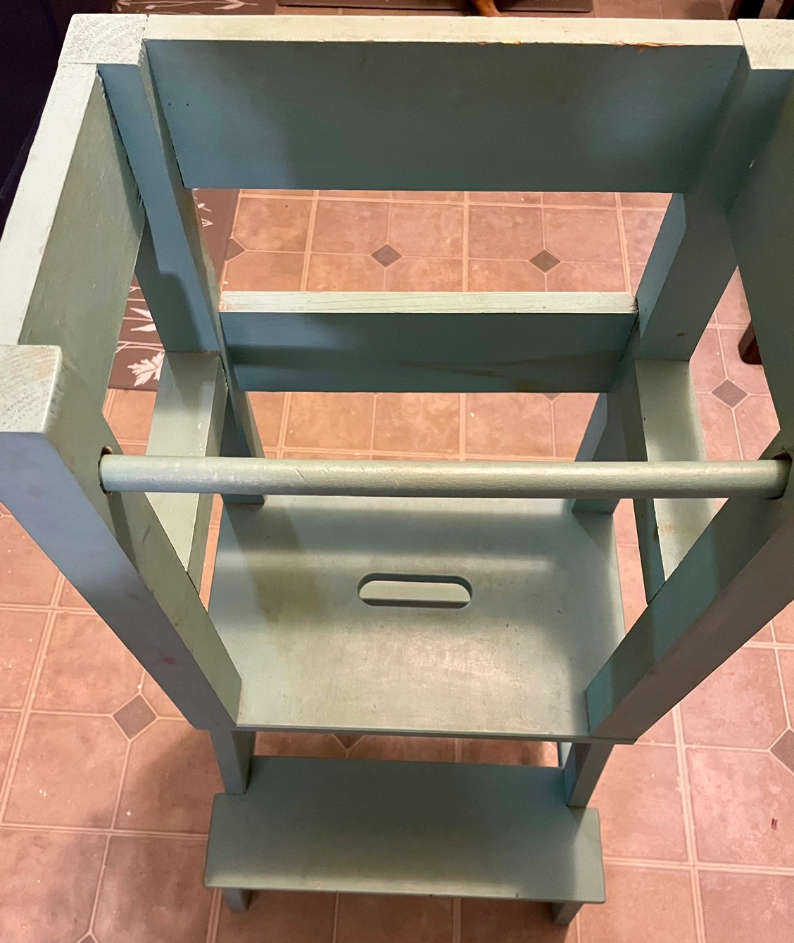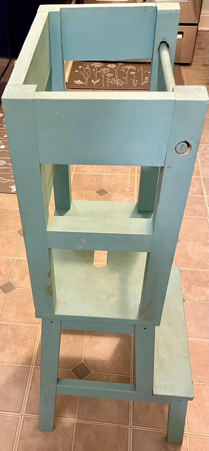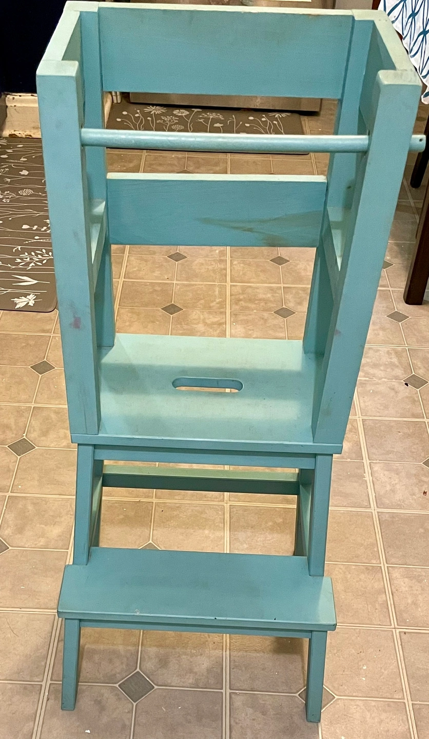 A sturdy, wooden learning tower that allows children to participate in kitchen activities safely. It features a step stool, a platform for standing, and a safety rail. The tower is painted a light blue colour.
