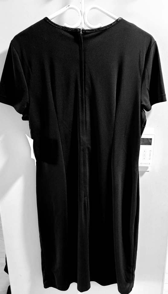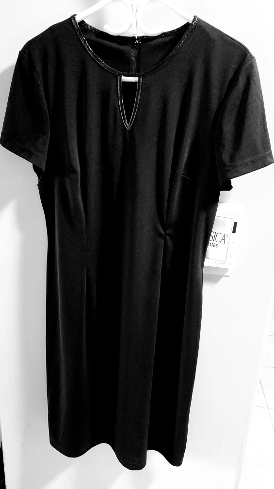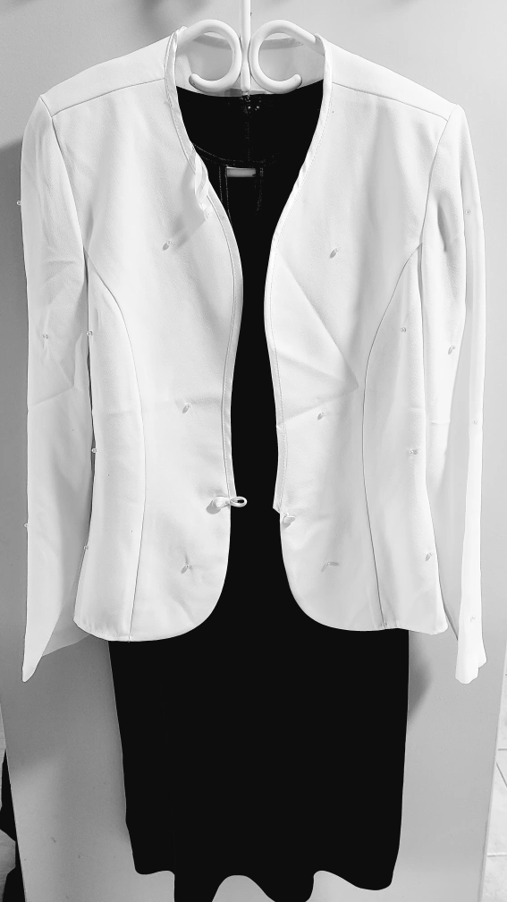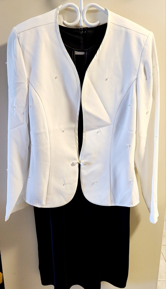 Black dress with a keyhole neckline and matching white jacket with pearl detailing. Brand new with tag.