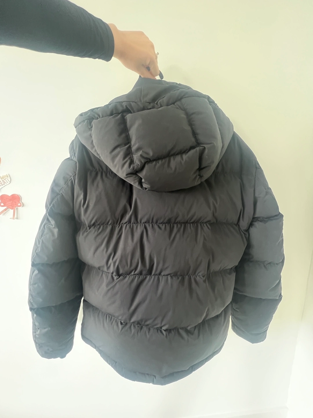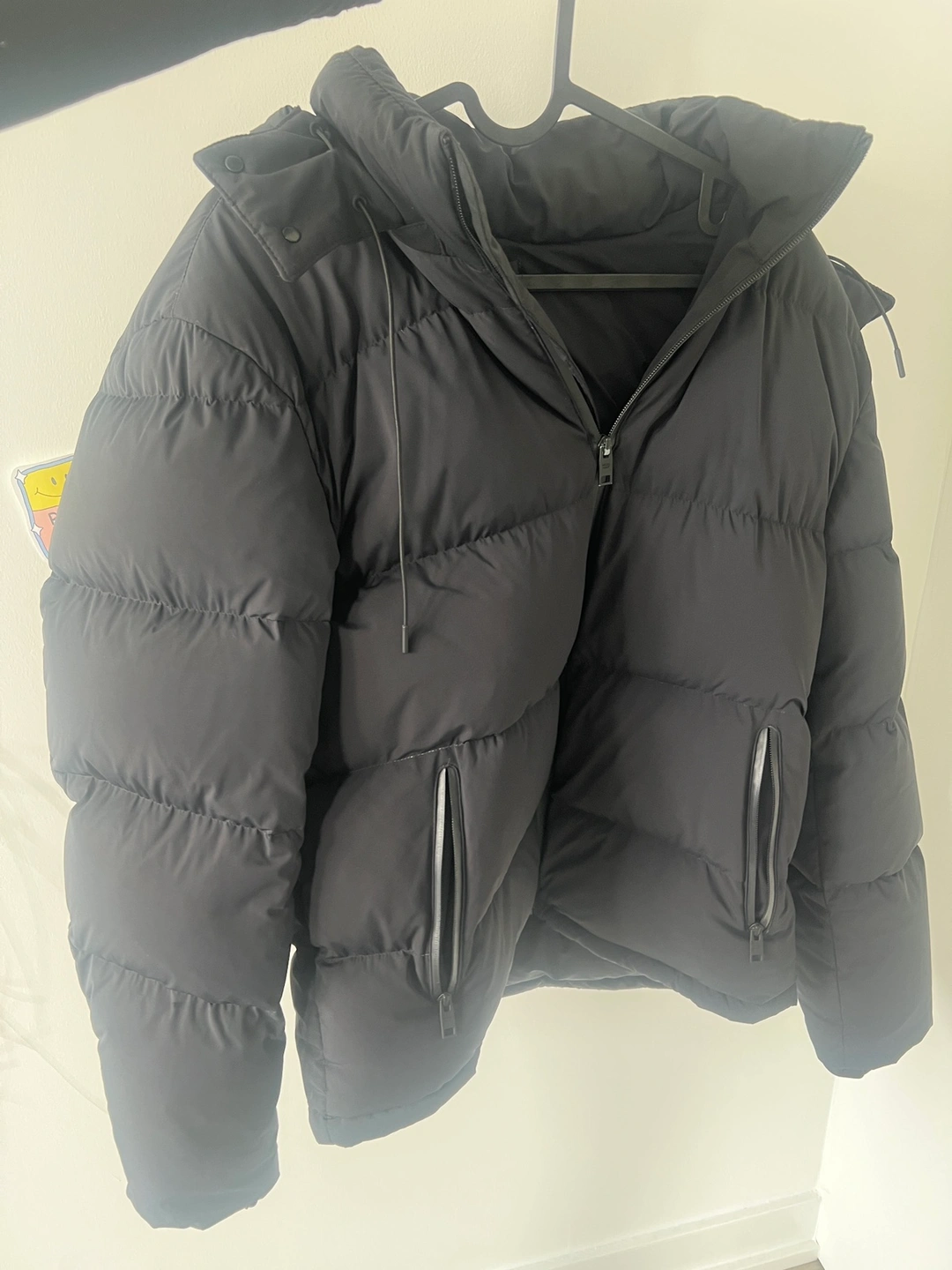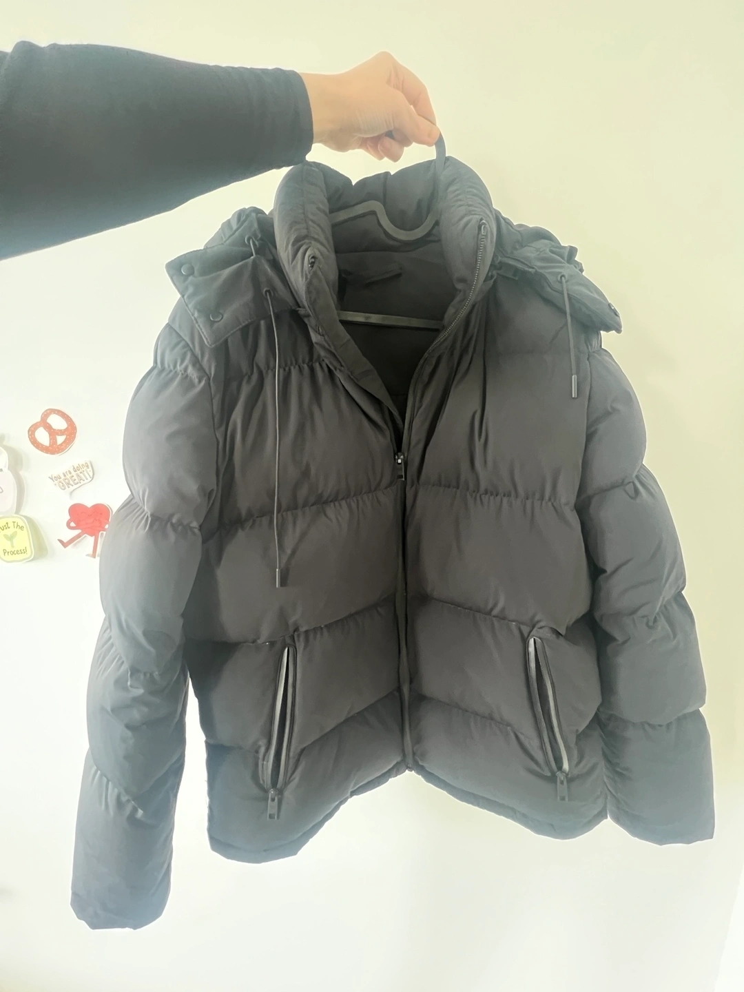 Men's black puffer jacket with a hood.