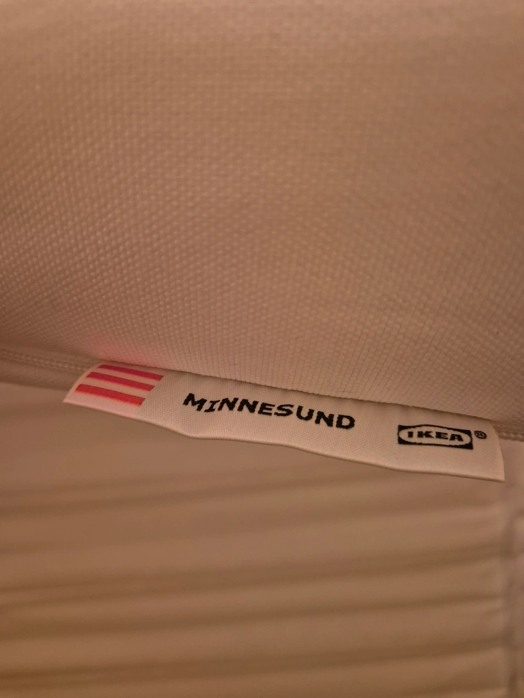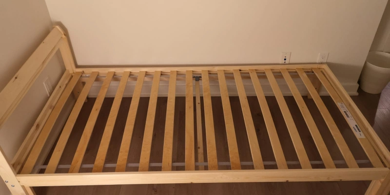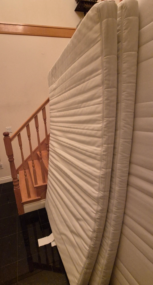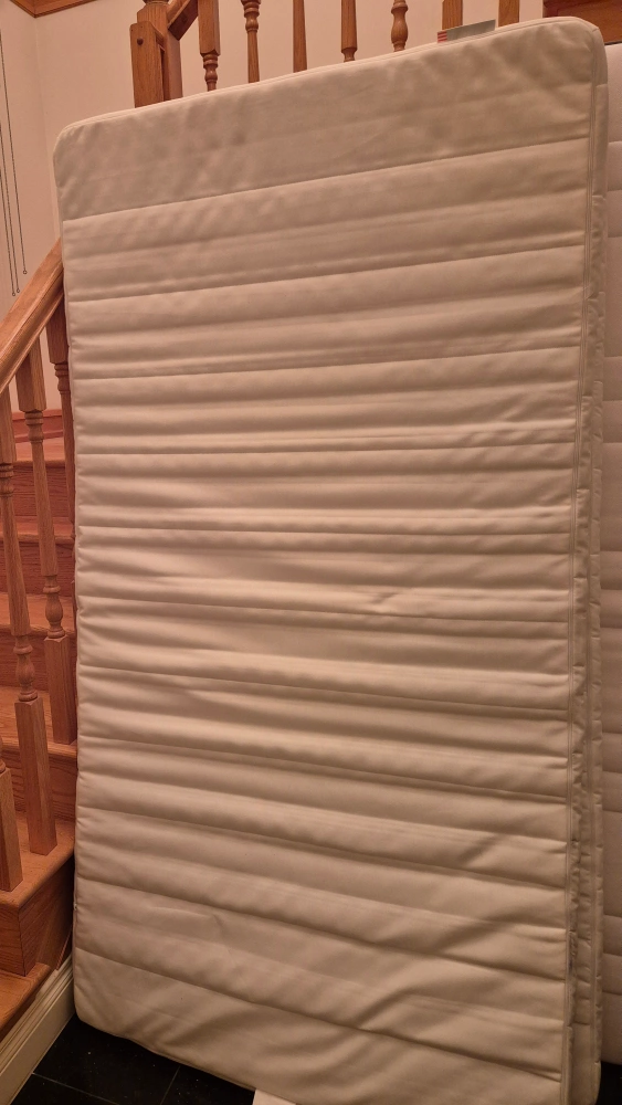 IKEA NEIDEN Twin Bed Frame includes slats, headboard, and Two MINNESUND mattresses. The bed and mattresses are in good condition and has been used lightly.