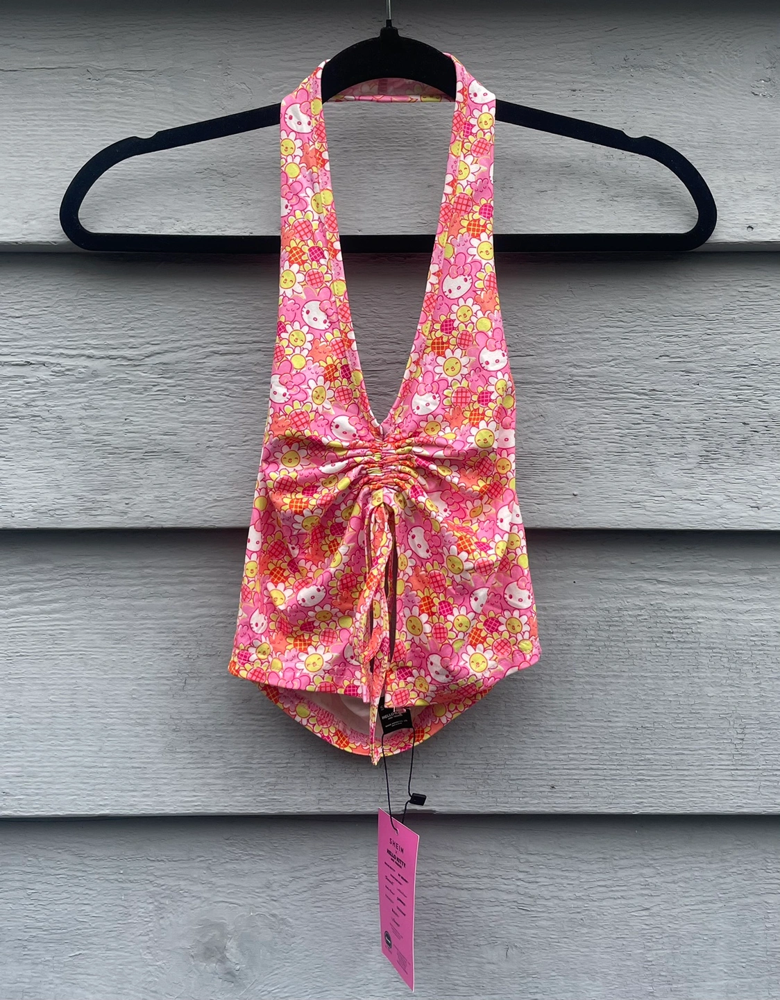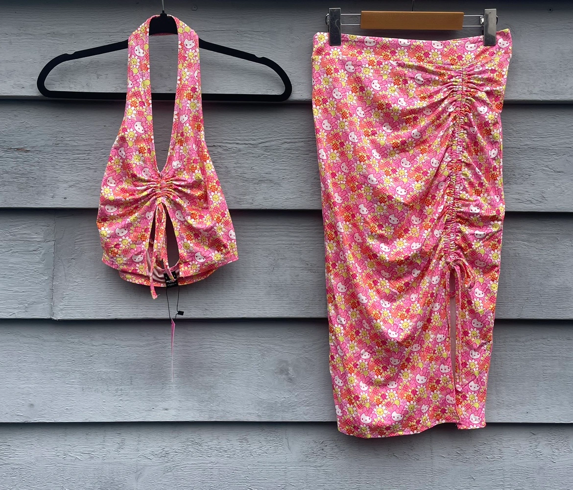 BNWT SHEIN collection with Hello Kitty & friends. I was going to use this for photoshoots but I wasn't a fan of the skirt on me. The top is a drawstring halter in size XS. The skirt also has a drawstring on the side as well. It's a size small. This set is sold out online on the website.