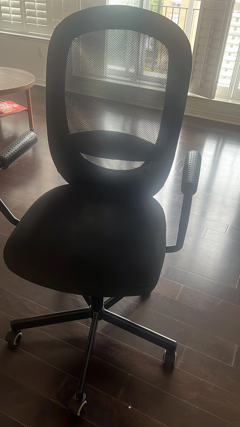 This is a black office chair with a mesh back and fabric seat. It has adjustable arms and a swivel base. The chair is in good condition and is ready for use.