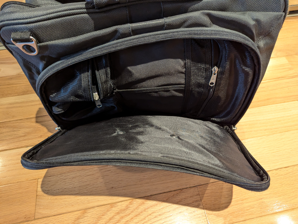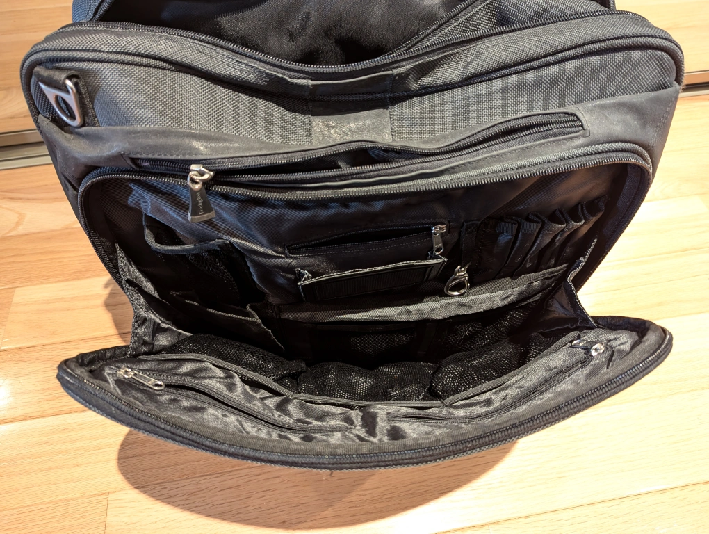 17 inch laptop bag. Has a separate laptop sleeve that can be used to just carry a laptop, plus light accessories. Many pockets for storage. Luggage strap on the back. Curved back side for comfort while shoulder carrying. bottle holder on both sides.