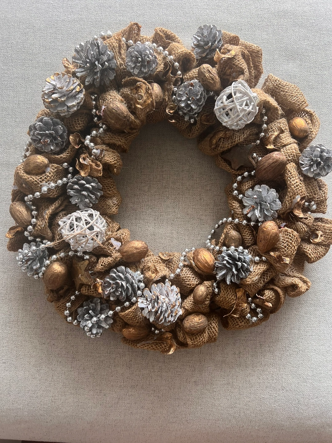 A Christmas outdoor wreath made with burlap, pine cones, and other decorations. Some walnuts are missing, but you can easily glue new ones, or add some colour to it with other items.