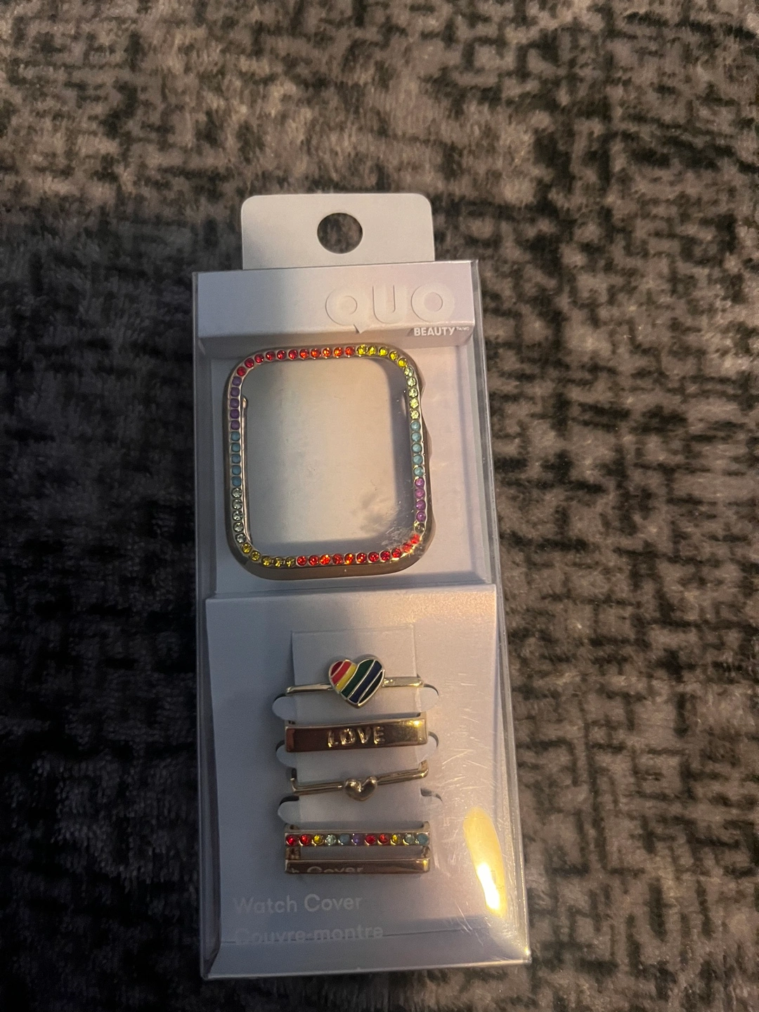 A gold watch cover with multicoloured gems around the edge and a set of four gold rings with designs and gemstones.