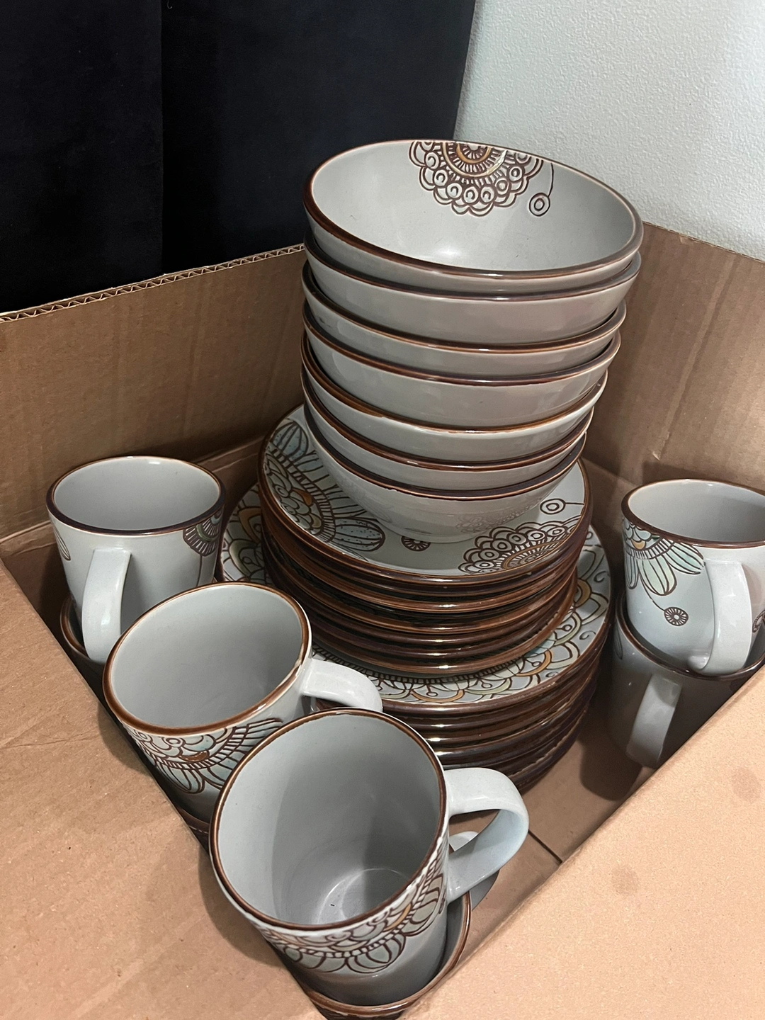 It includes: 8 mugs, 8 smaller plates, 8 bigger plates, 7 bowls.