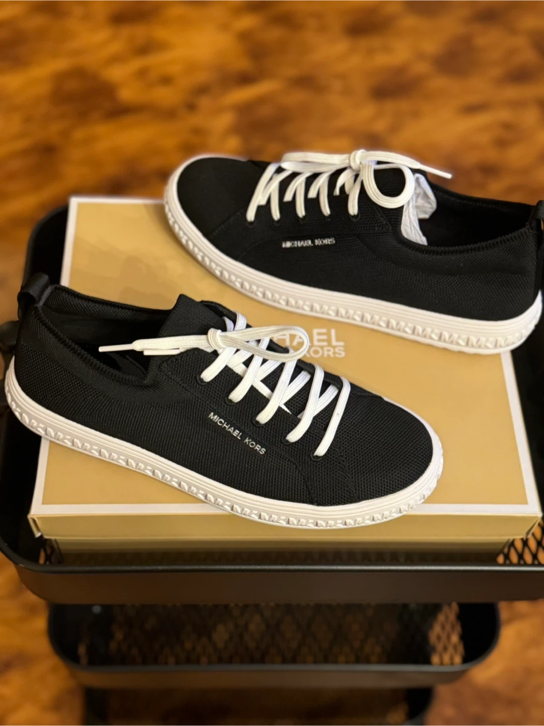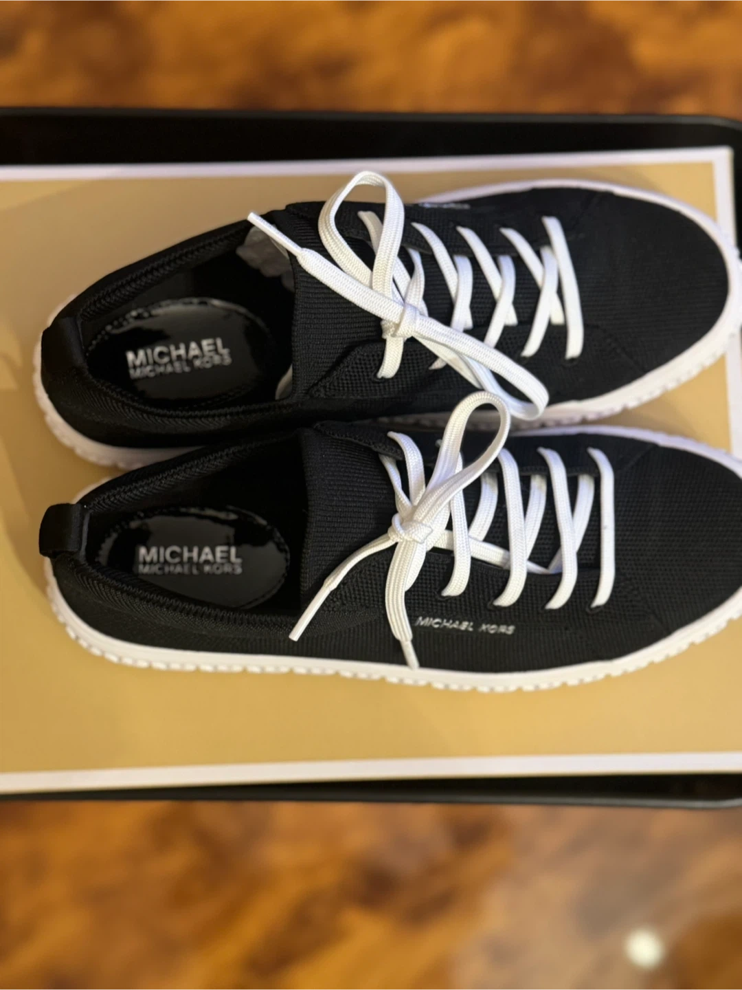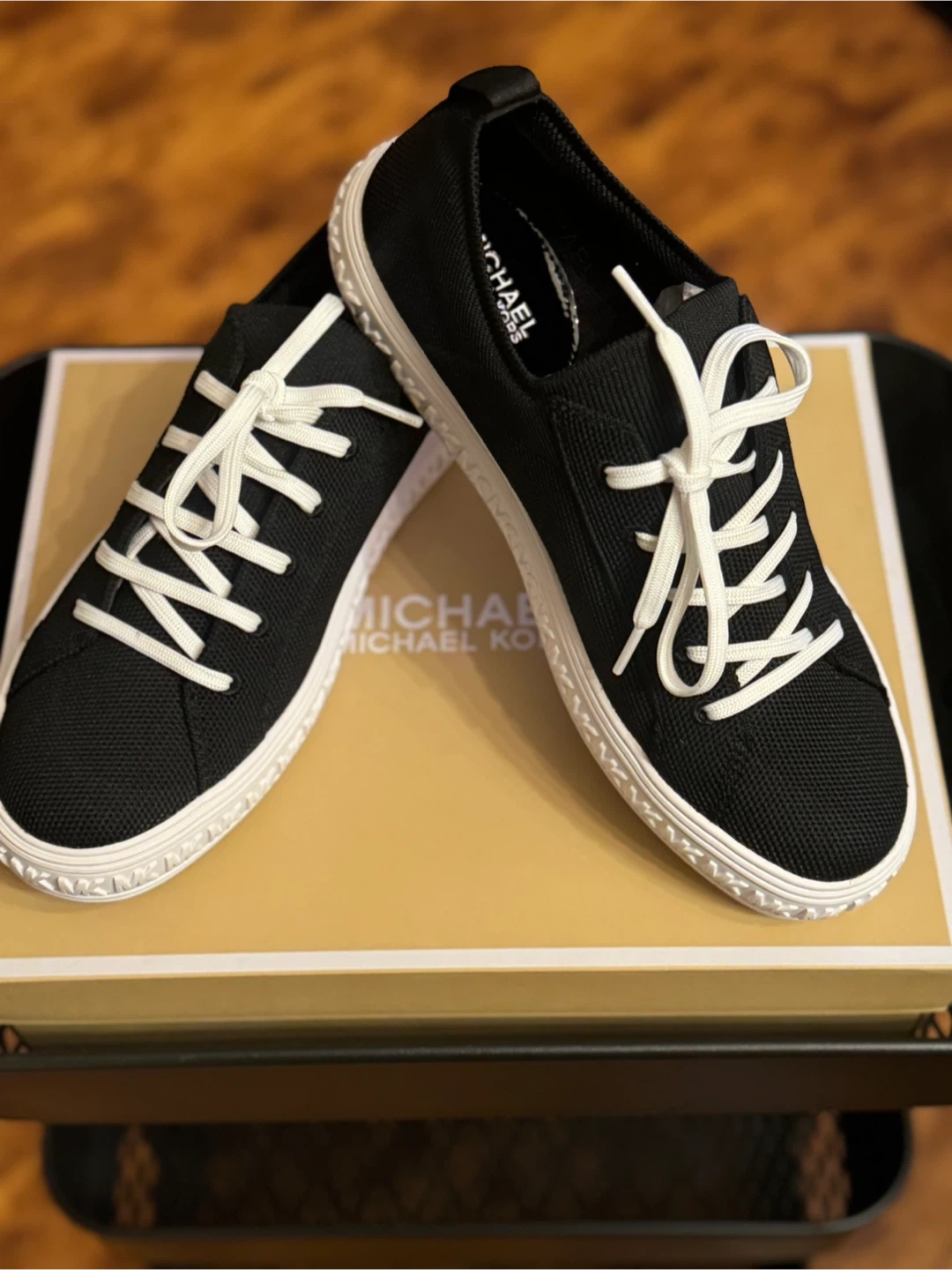 These Michael Kors sneakers are black with white laces and soles. They're made of a breathable textile material. The original box is included.