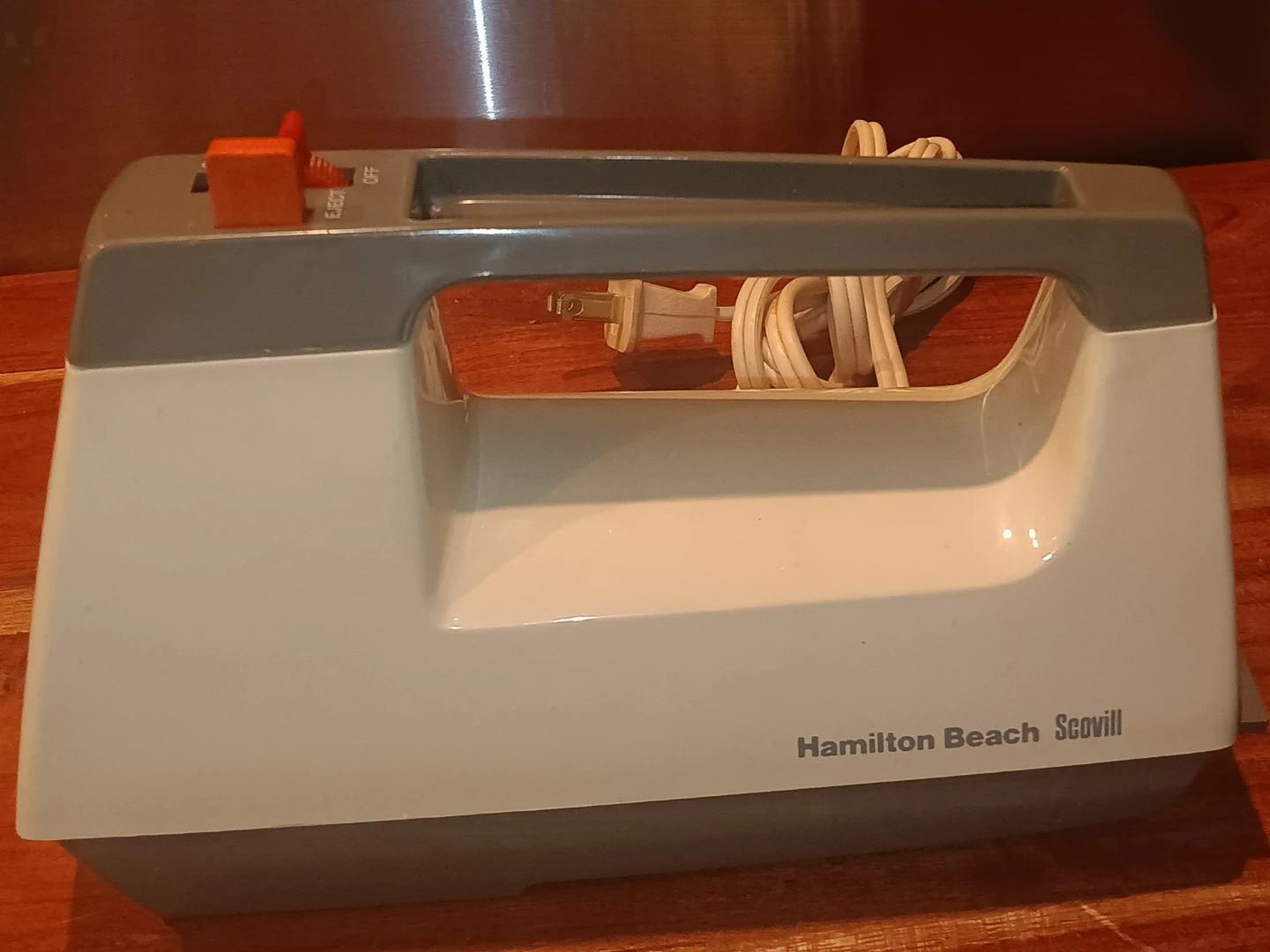 This is a VINTAGE Hamilton Beach Scovill hand mixer, model 151. It's a food preparing machine. It comes with beaters and a cord.
