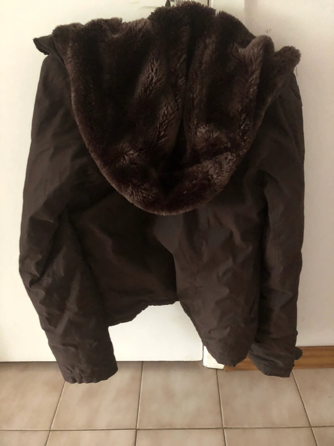 A brown winter jacket with hood. The jacket is water resistant and windproof with a quilted lining. It also has a zipper and magnetic button closure.