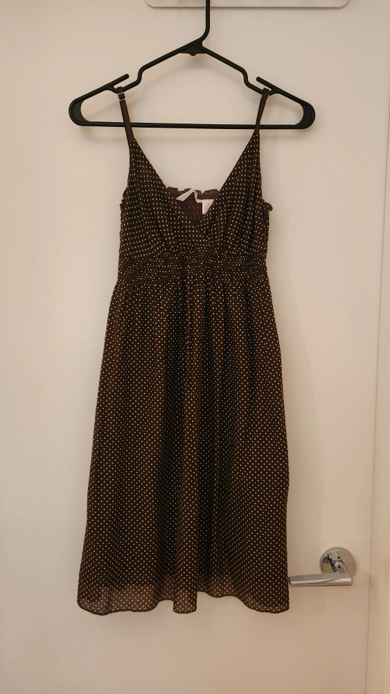 A cute and casual brown dress with white polka dots and a fitted bodice. It has thin spaghetti straps and an extra layer underneath so it's not see through. The dress has a smocked waist. It is perfect for casual summer events.