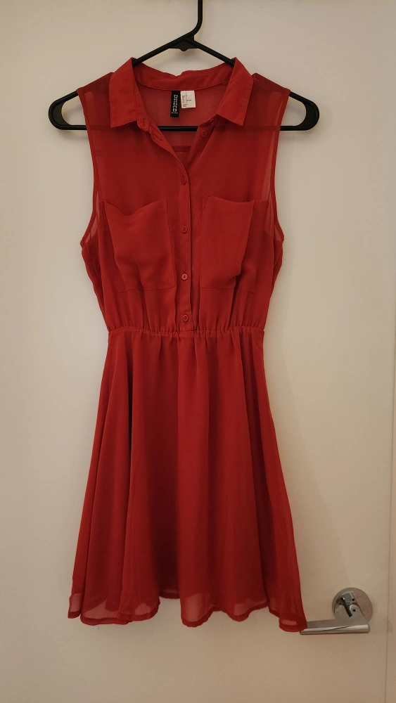 269Sleeveless red dress with a collared neckline and a button-up front. The dress has a fitted bodice and a flowy skirt. It is made of a light and airy material. There's an extra layer underneath the dress. Great for Christmas and special events.