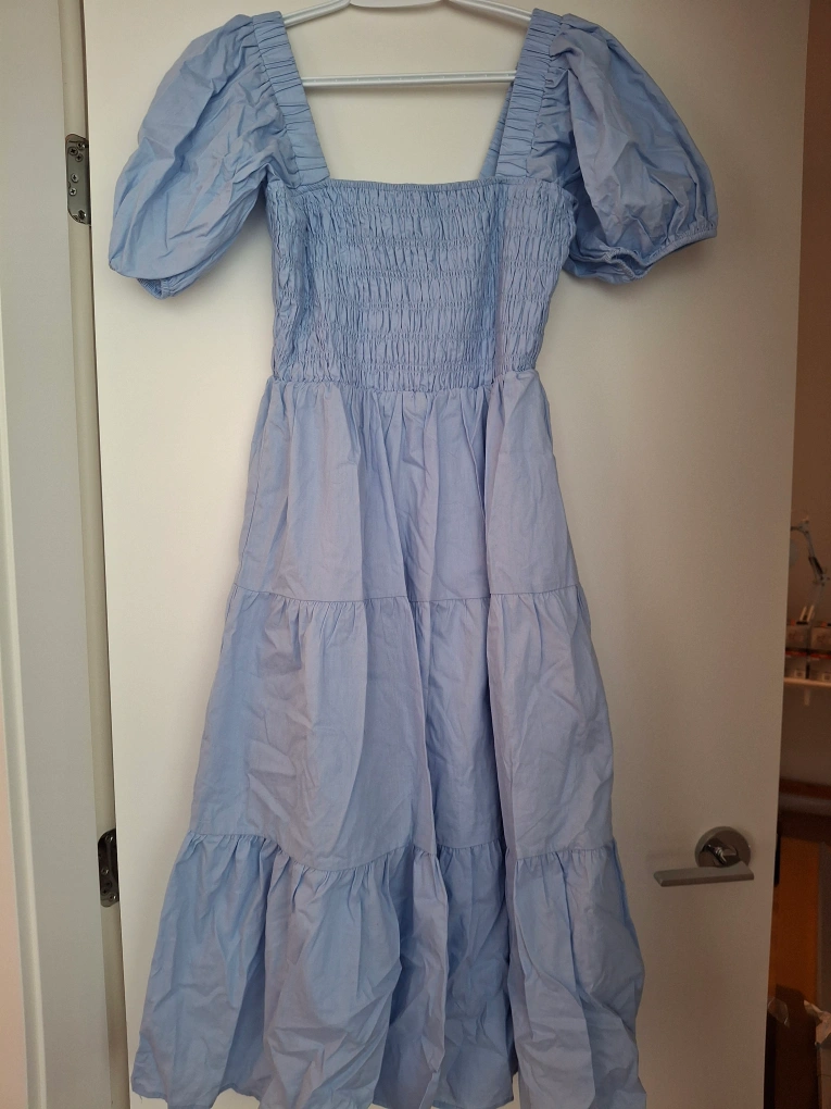 A light blue, short-sleeved dress with a smocked bodice and tiered skirt. Worn once for a photo shoot. Cotton material, light weight and beautiful color.