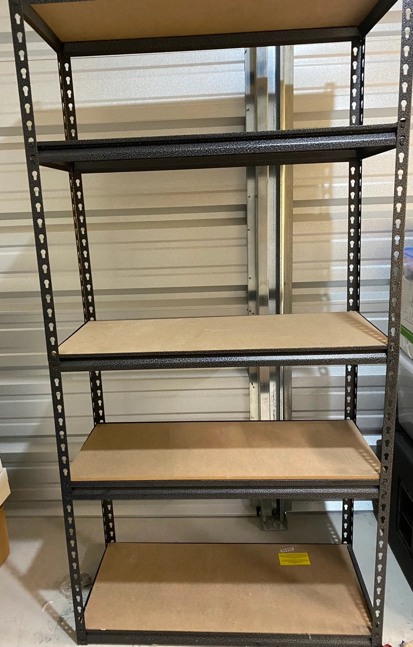 This is a metal shelving unit. It has four shelves and is made of metal. It is in good condition. It has been used for storage and is now ready for a new home. It is very sturdy.