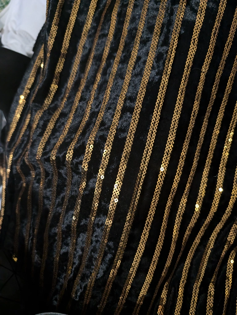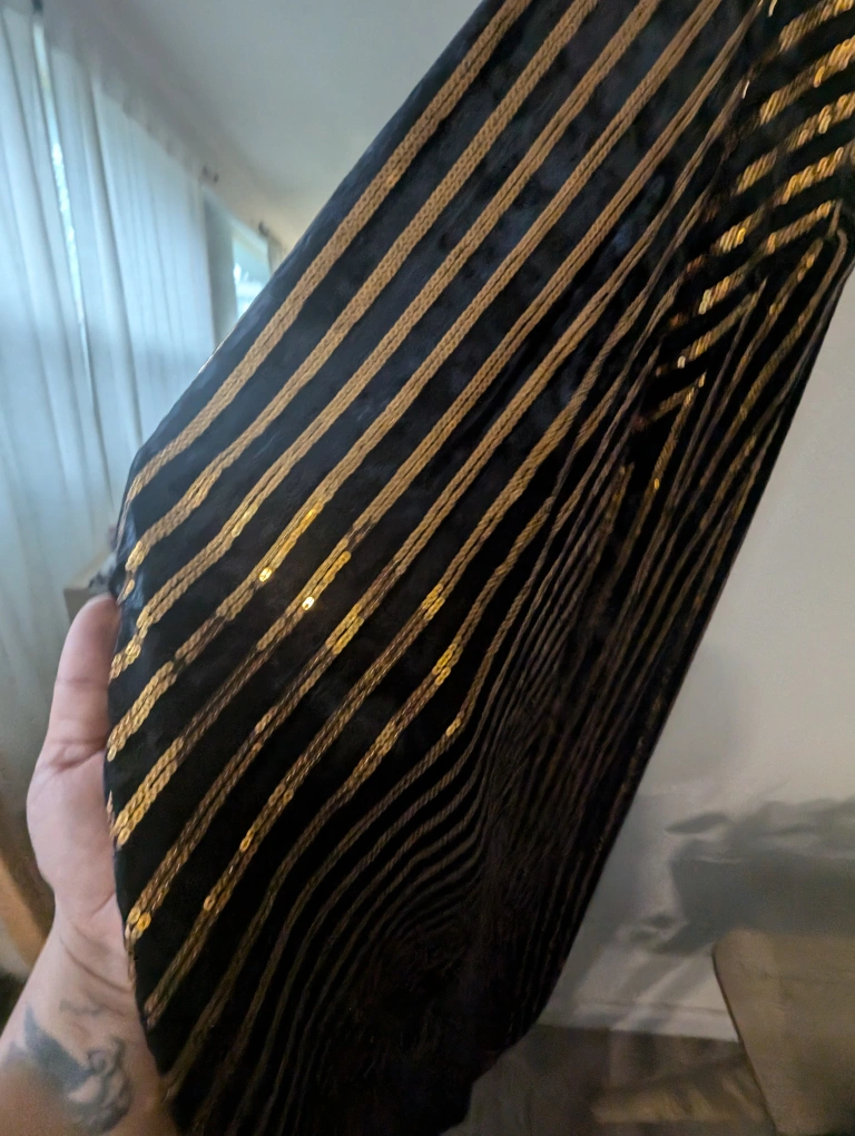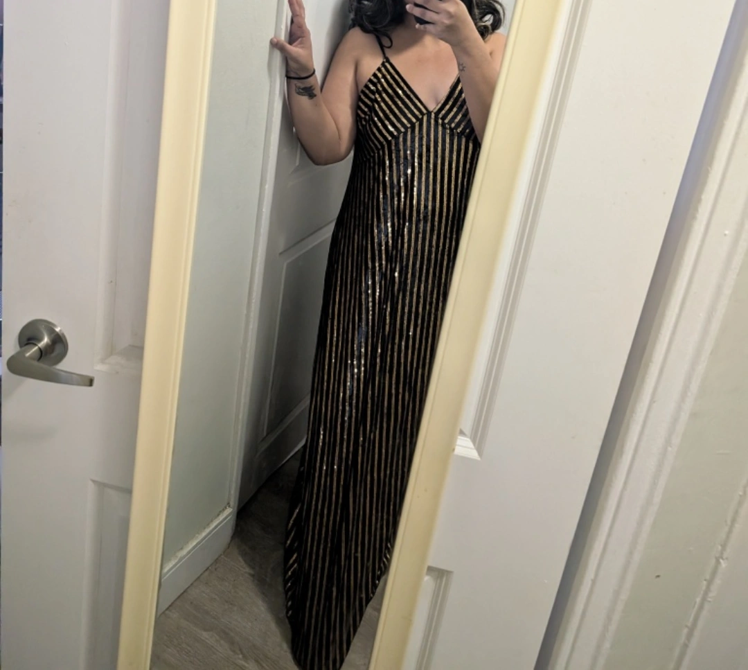 This is a beautiful black and gold sequin maxi dress with adjustable straps. It is a flattering and comfortable dress that is perfect for a night out. The dress has a V-neckline and a flowy skirt that hits the ankles. It is a great choice for any occasion. Never worn out. prom/Halloween /night out /party. fits m-L-Xl