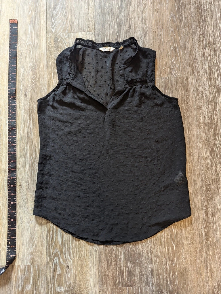 Black sleeveless blouse with a V-neck and a ruffle trim. The blouse has a dot design. It is size XS