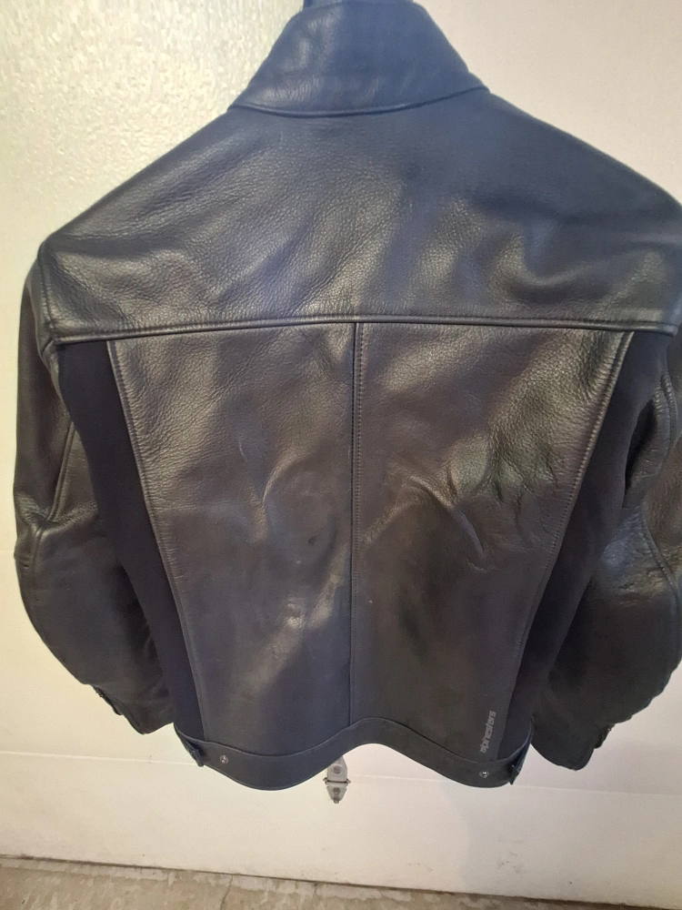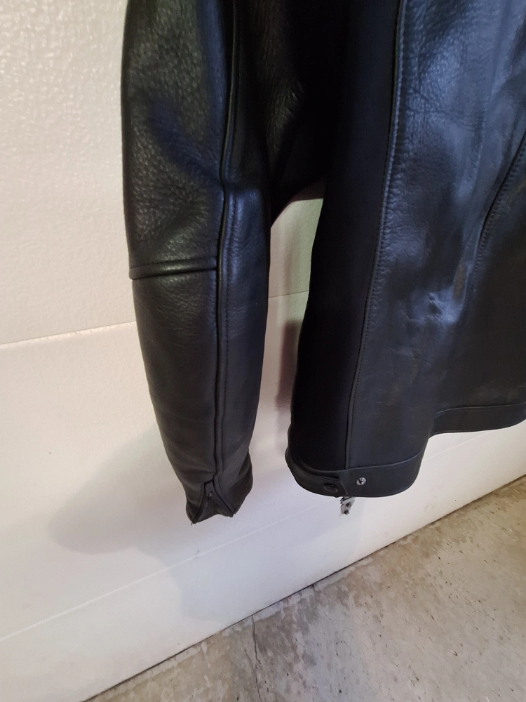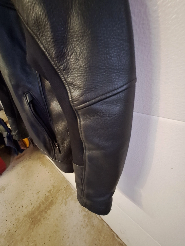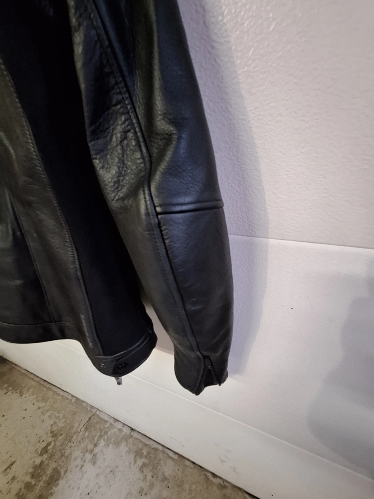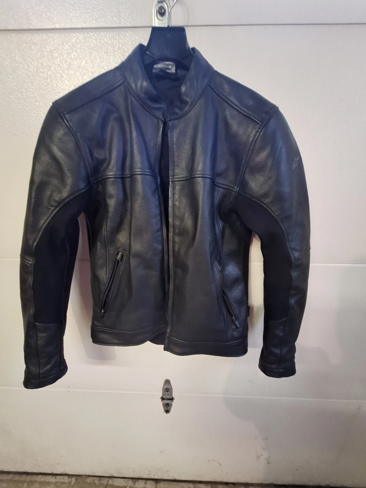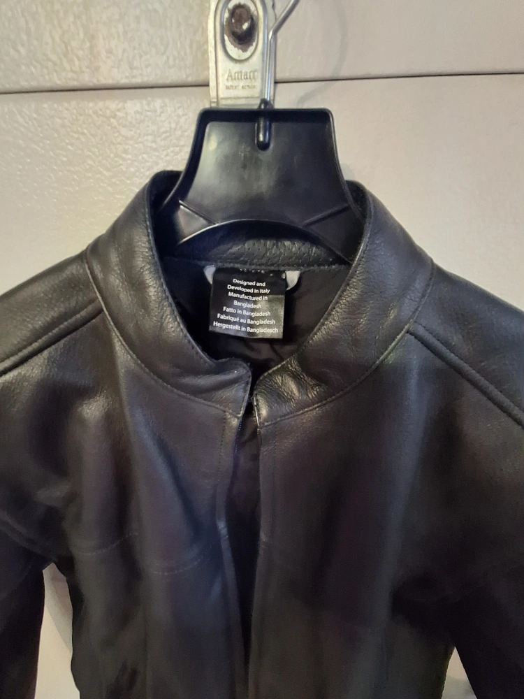 The Topanga leather road/bike jacket with zipper closure. Two zippered pockets, 2 inner liner pockets elasticized for secure storage.