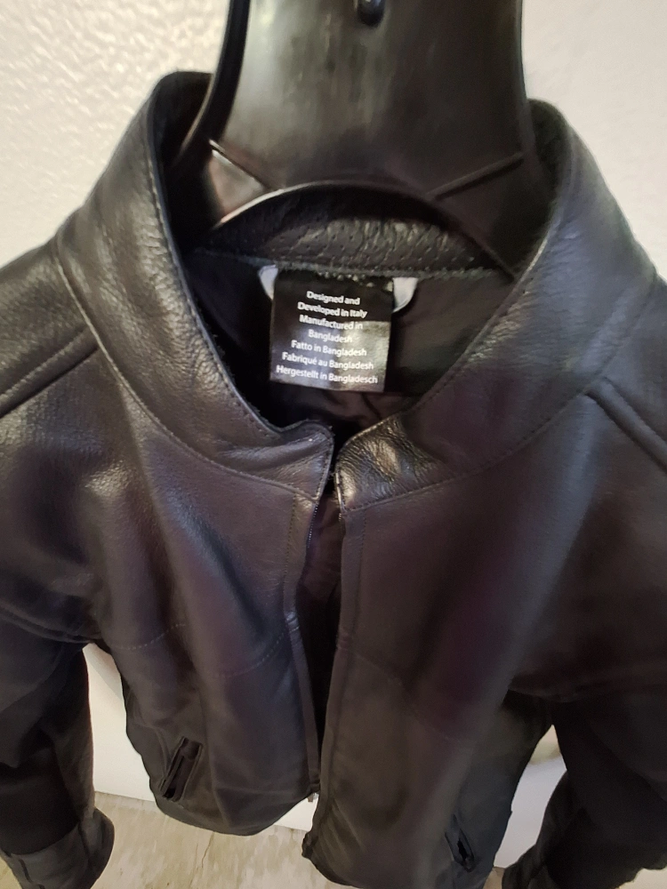 The Topanga leather Jacket is equipped with Nucleon Flex Plus armor on the shoulders and elbows for effective impact protection in key areas. The jacket is designed and developed in Italy. The tag says it is made in Bangladesh.