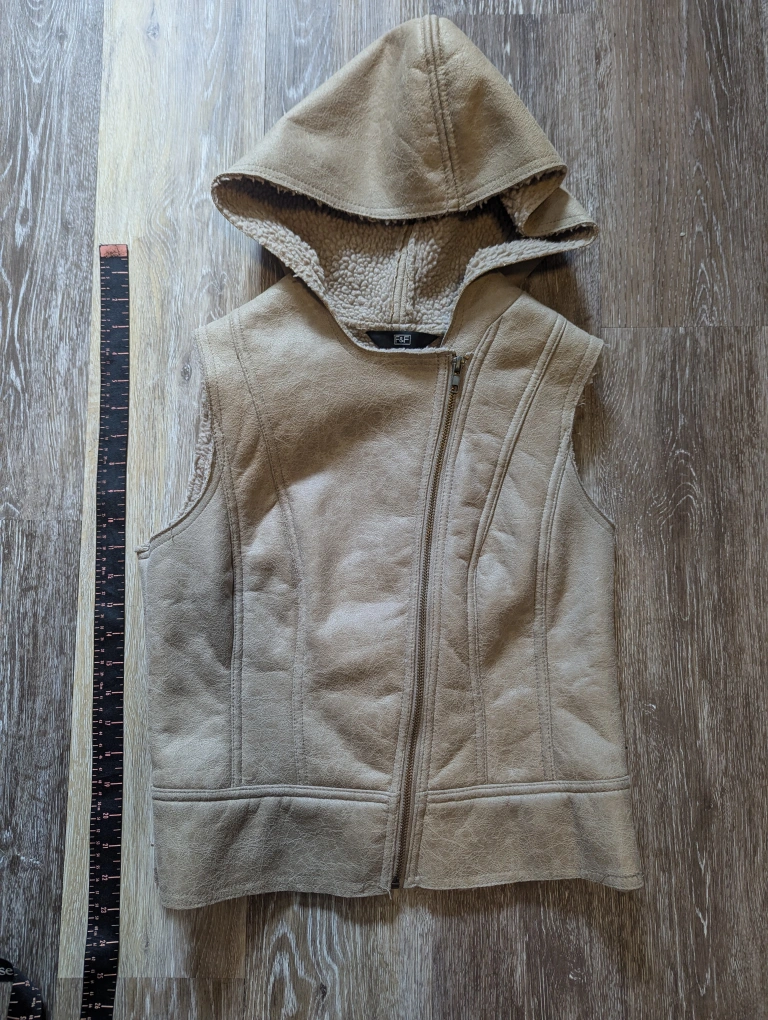 Tan faux suede hooded vest with zipper closure. The vest is lined with a soft, fuzzy material. It is sleeveless.