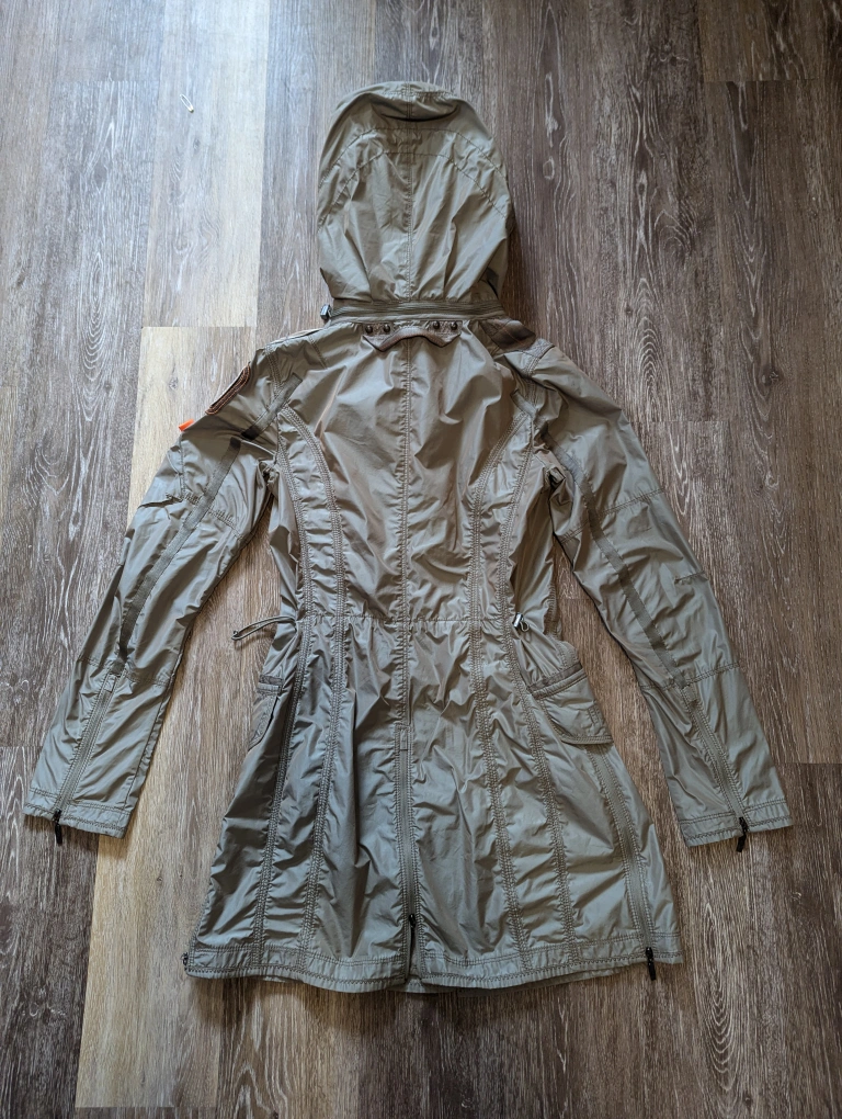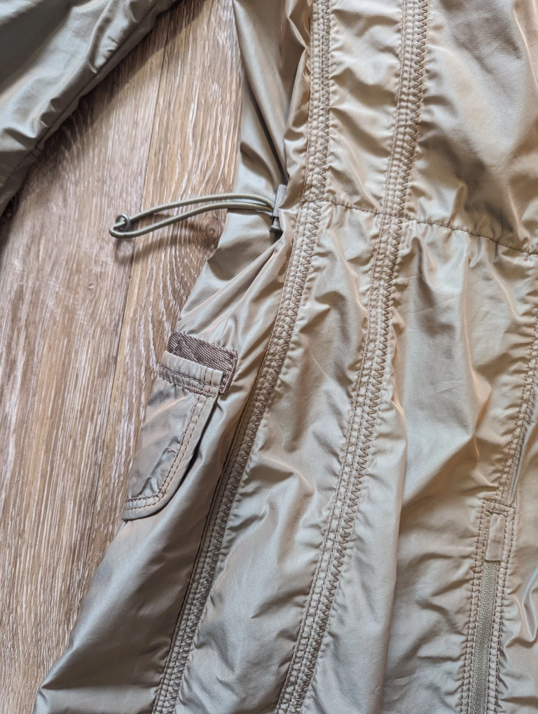 A size small, light-weight windbreaker jacket. Features a hood and multiple pockets. Gorgeous zippers! In excellent condition.