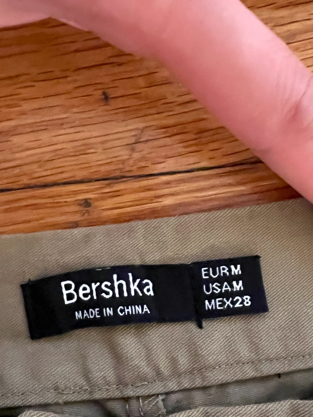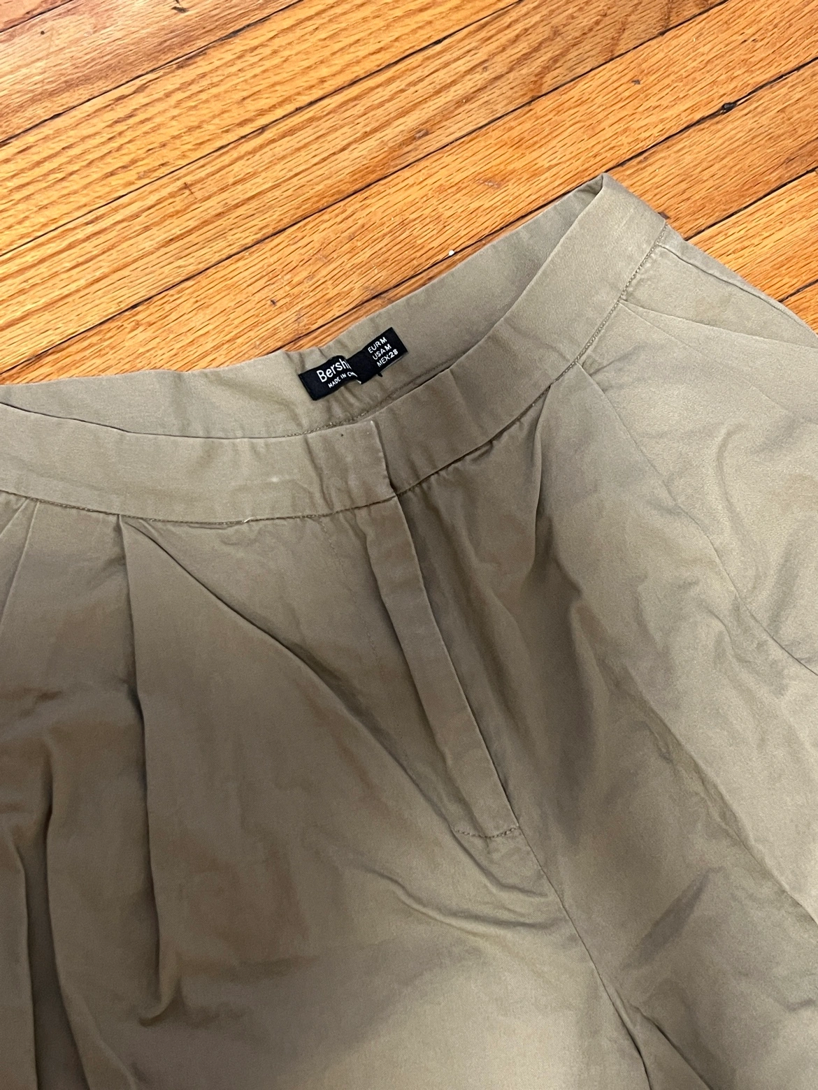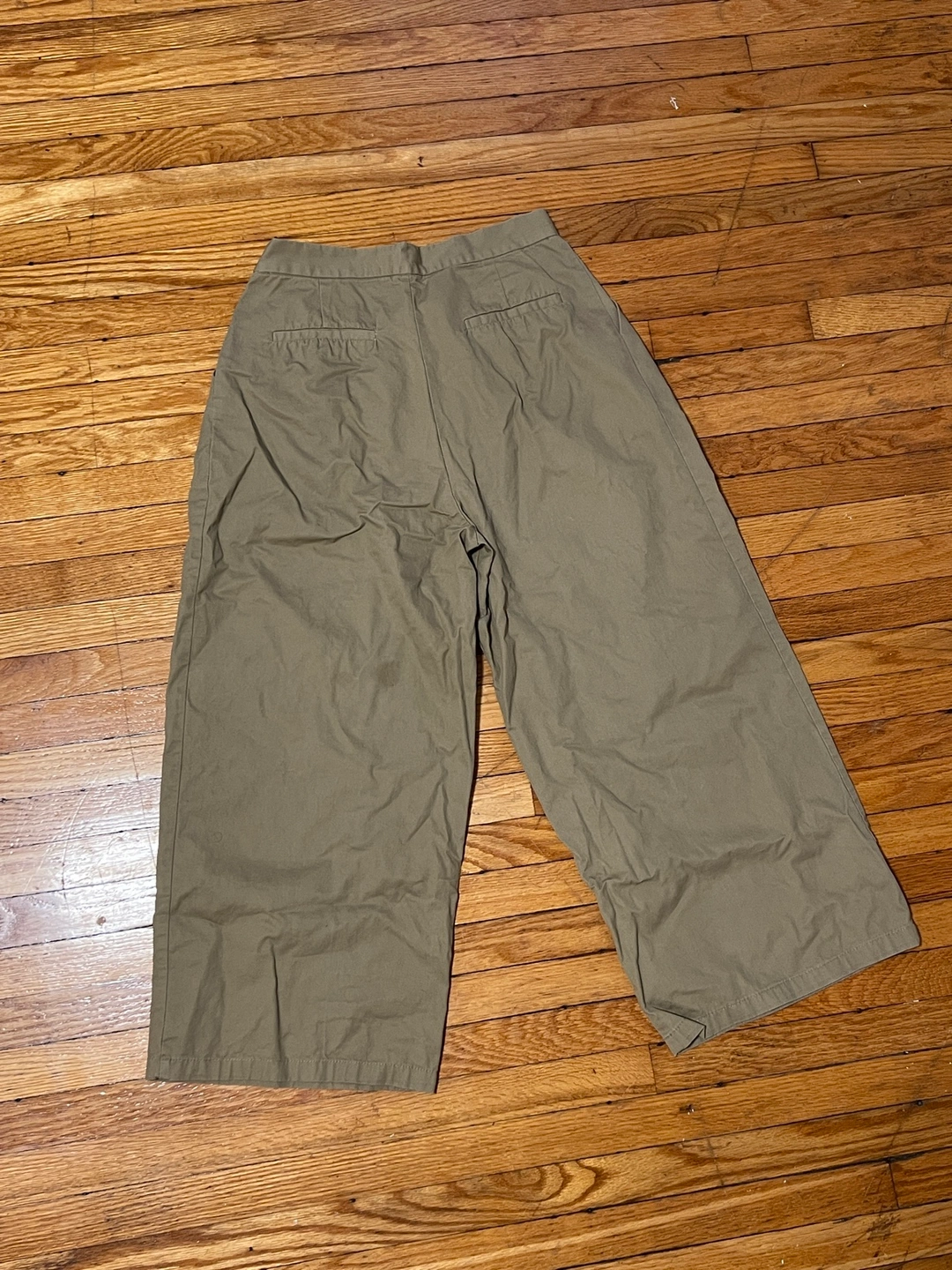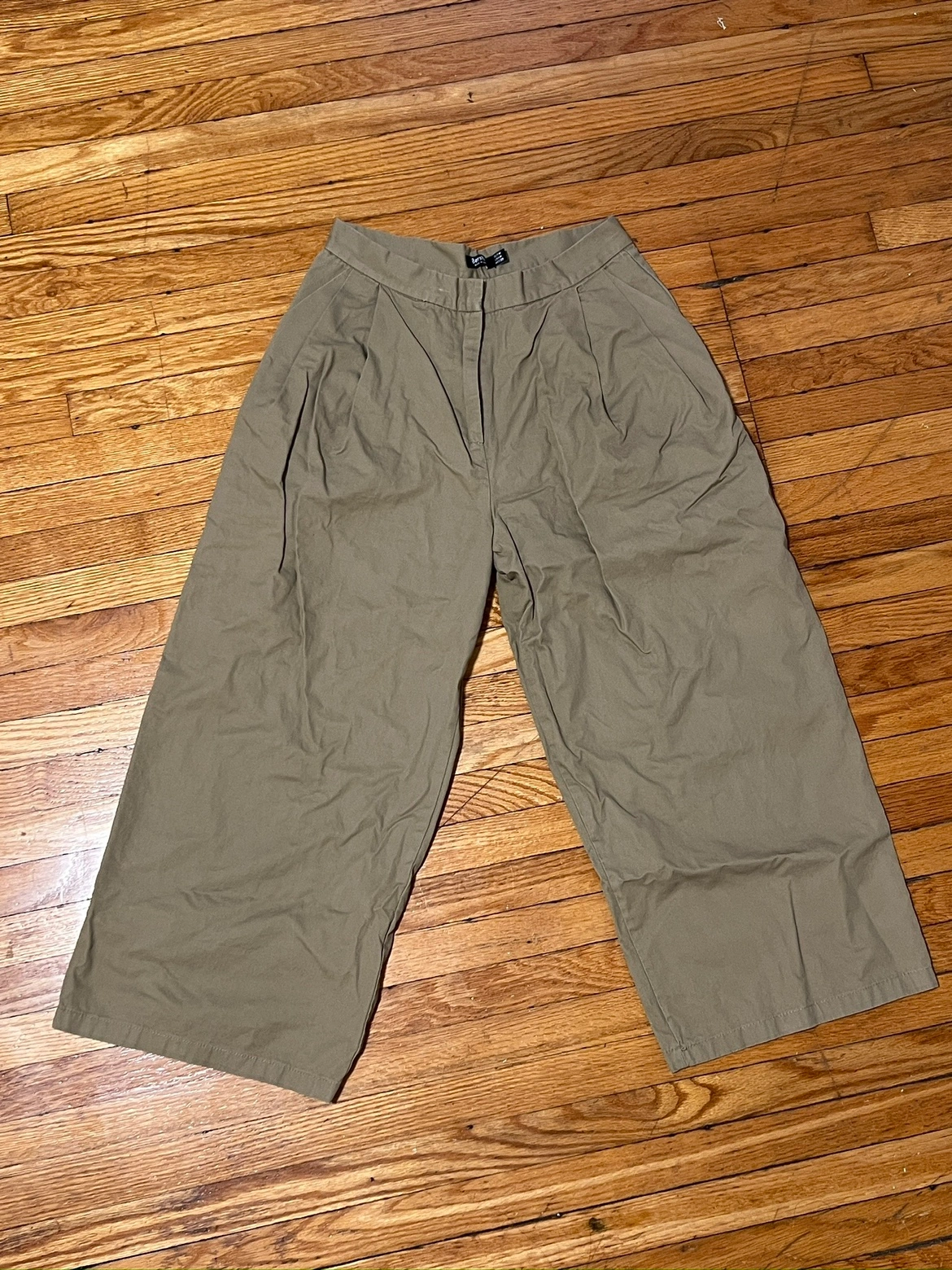 Light brown wide-leg trousers with a high waist and pleats at the front. They have pockets in the back. They are a size M. Trousers length 24.7” in seam 16”
