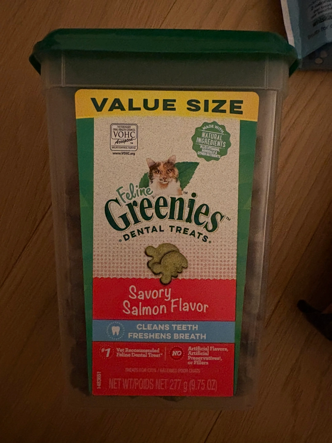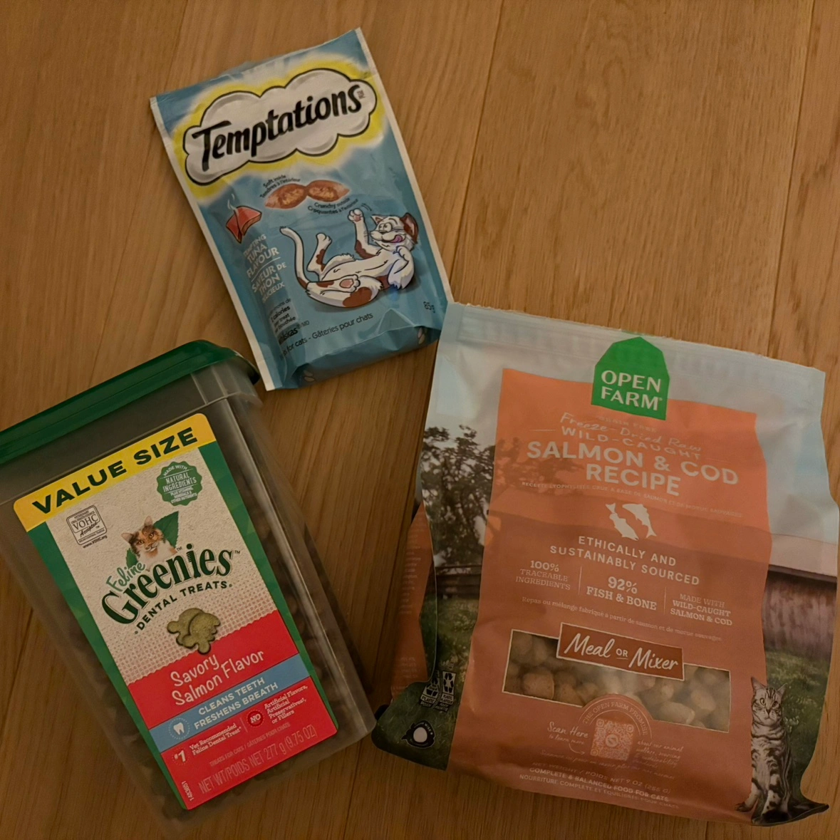 FREE OPENED UNEATEN bundle of cat treats including Temptations Tuna Flavour, Open Farm Frozen Raw Salmon & Cod, and Feline Greenies Savory Salmon flavour.