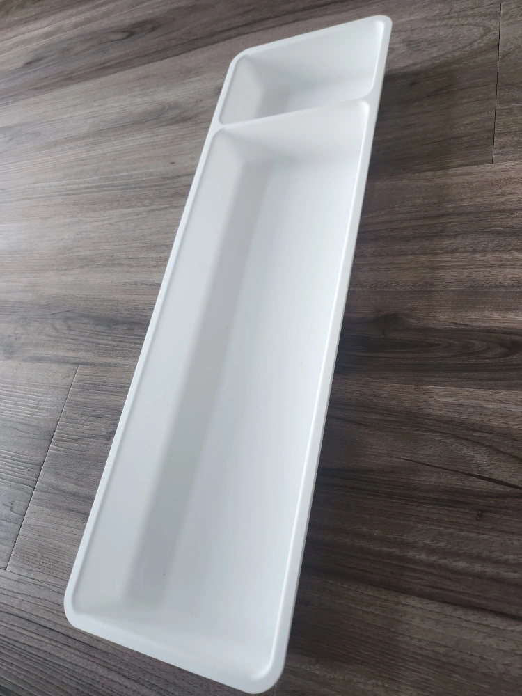 A divided white tray. Perfect for organizing kitchen drawers or other storage areas. Measures 50 x 15 cm.