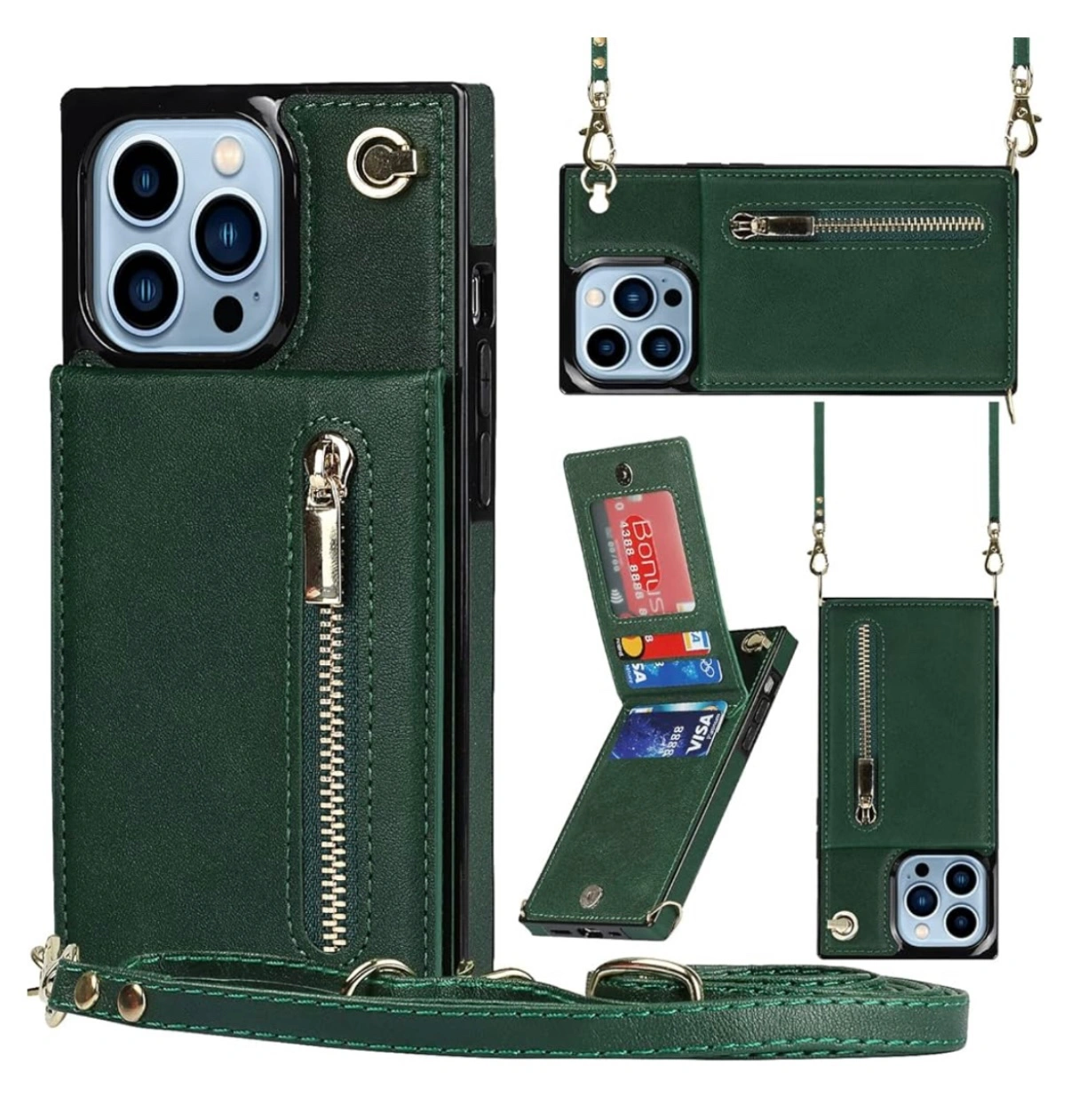 This green phone case comes with a strap and a wallet. It has a kickstand feature for watching videos and reading. Can be strapped vertical like a lanyard or horizontal like a purse. Adjustable strap. Super handy for travel and going out! Place for cards, coins and cash. Loved it but upgraded phone and it’s too small now :(