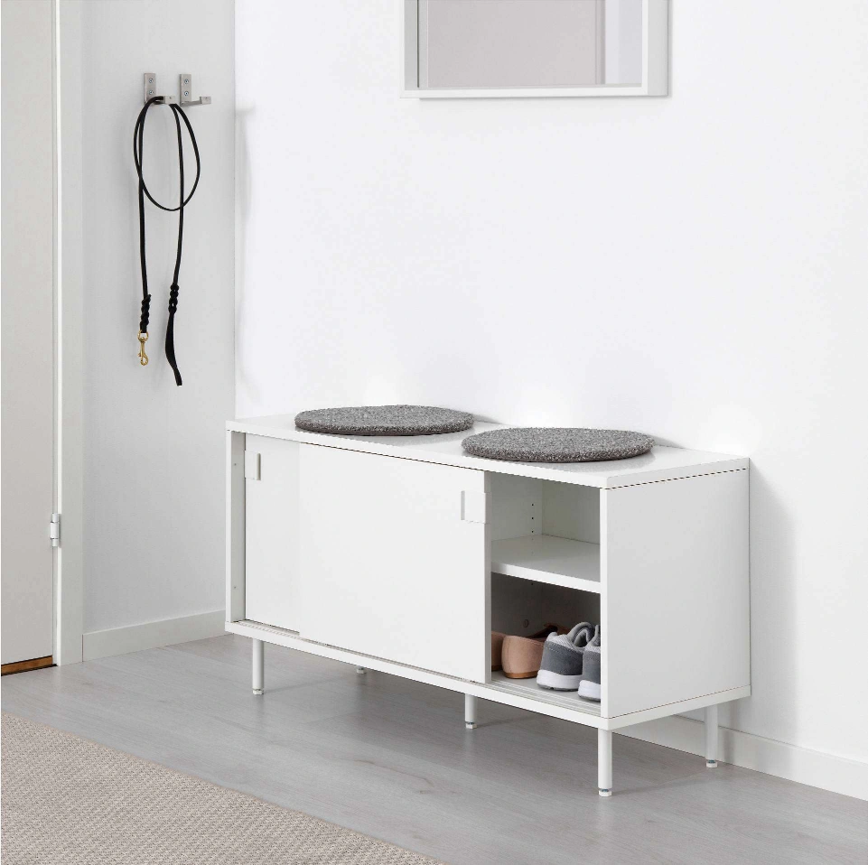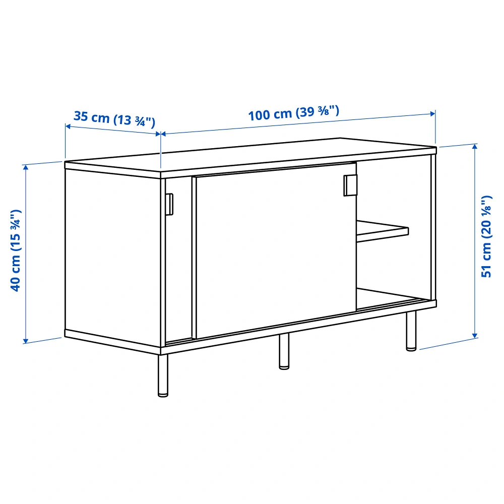 White cabinet with two sliding doors. The cabinet features one shelf. There are metal legs on the bottom. The cabinet is in good condition.