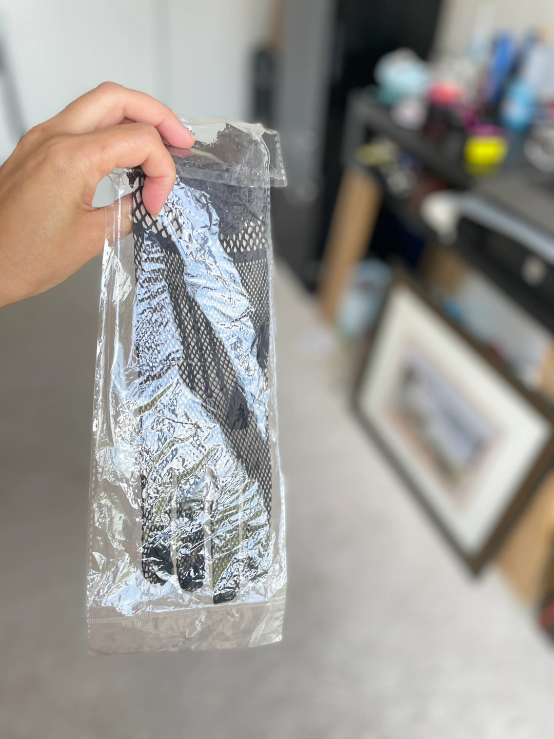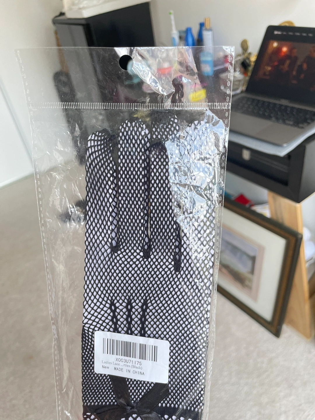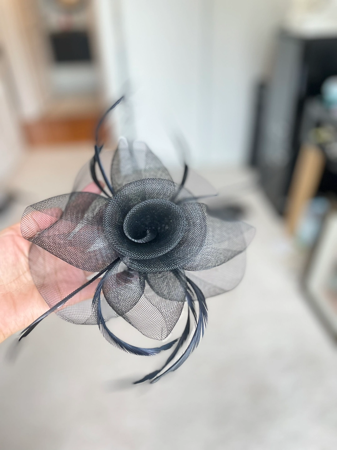 Black fishnet gloves and a matching black mesh flower hat accessory with feathers.great for Halloween costumes