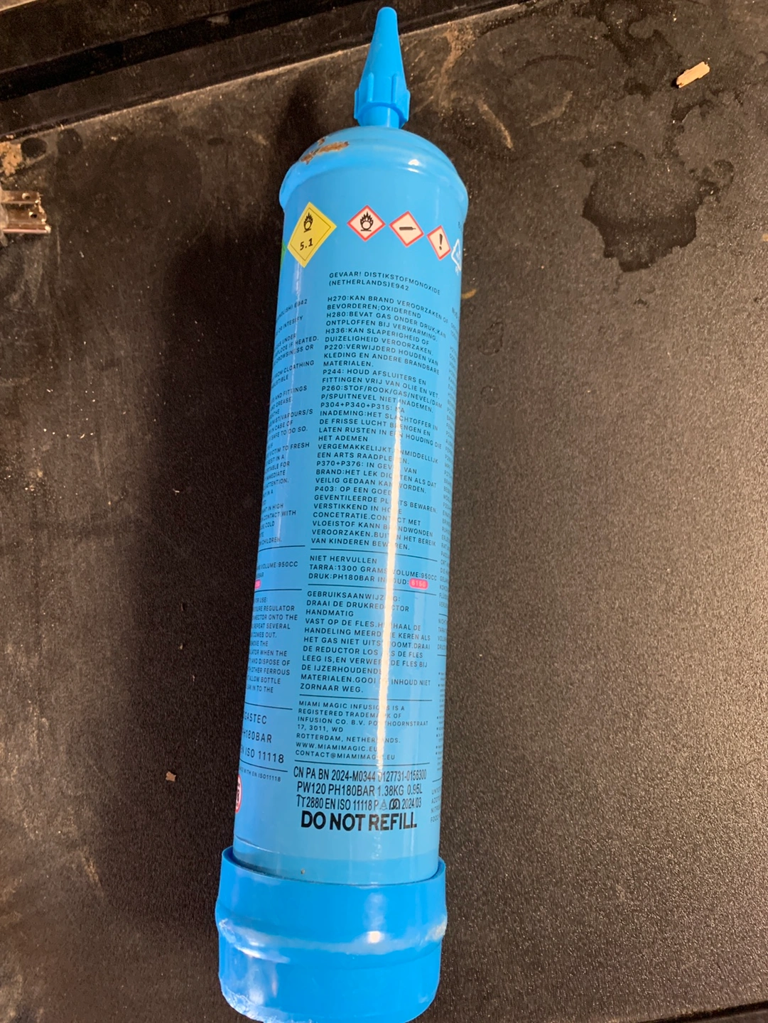 I found this canister of Miami Magic Infusion Nitrous Oxide. I was cleaning out a storage unit that I was renting out, and found this in there. The can seems a bit damaged on the outside but upon checking other does not seem to have been used.
