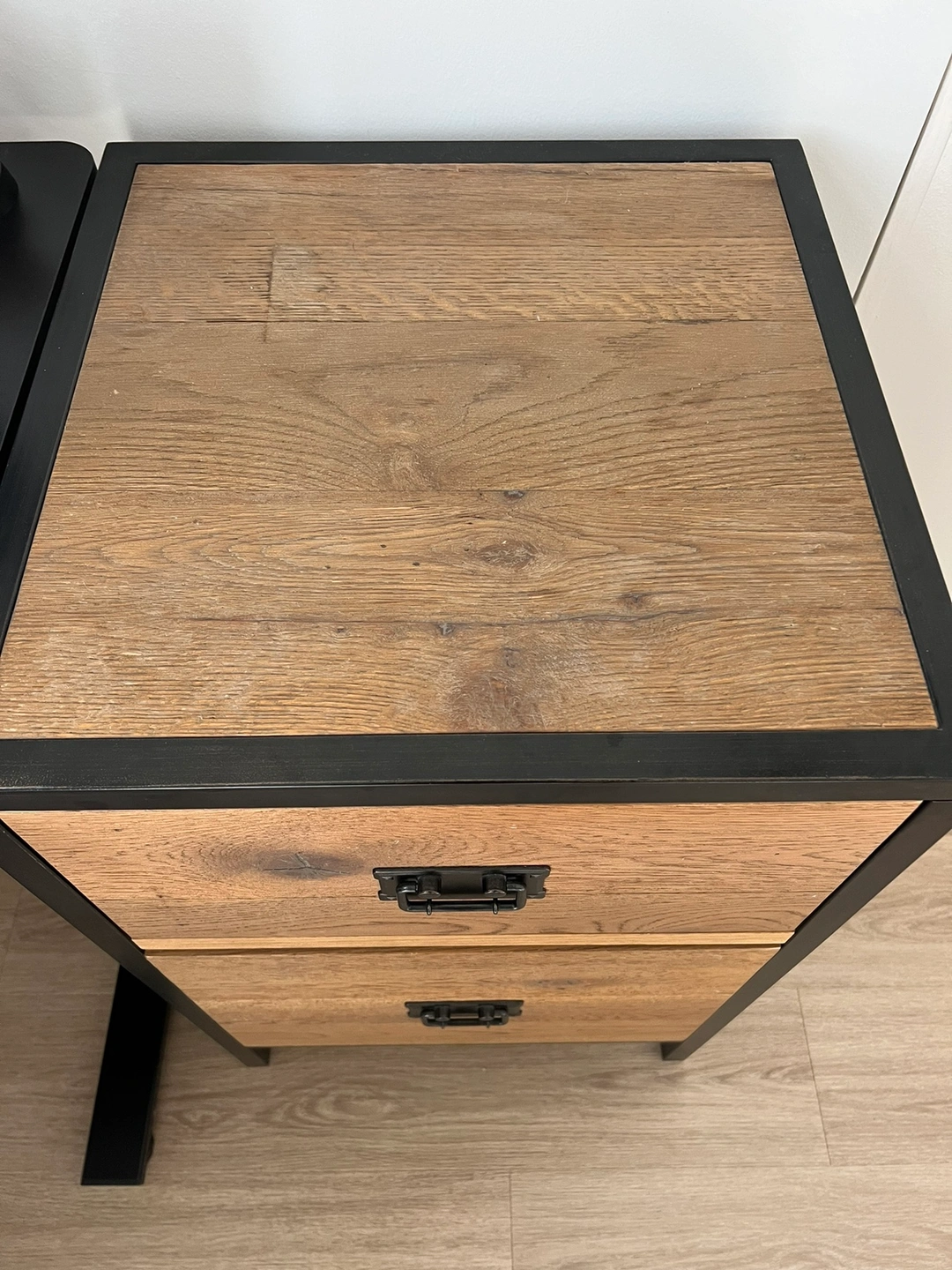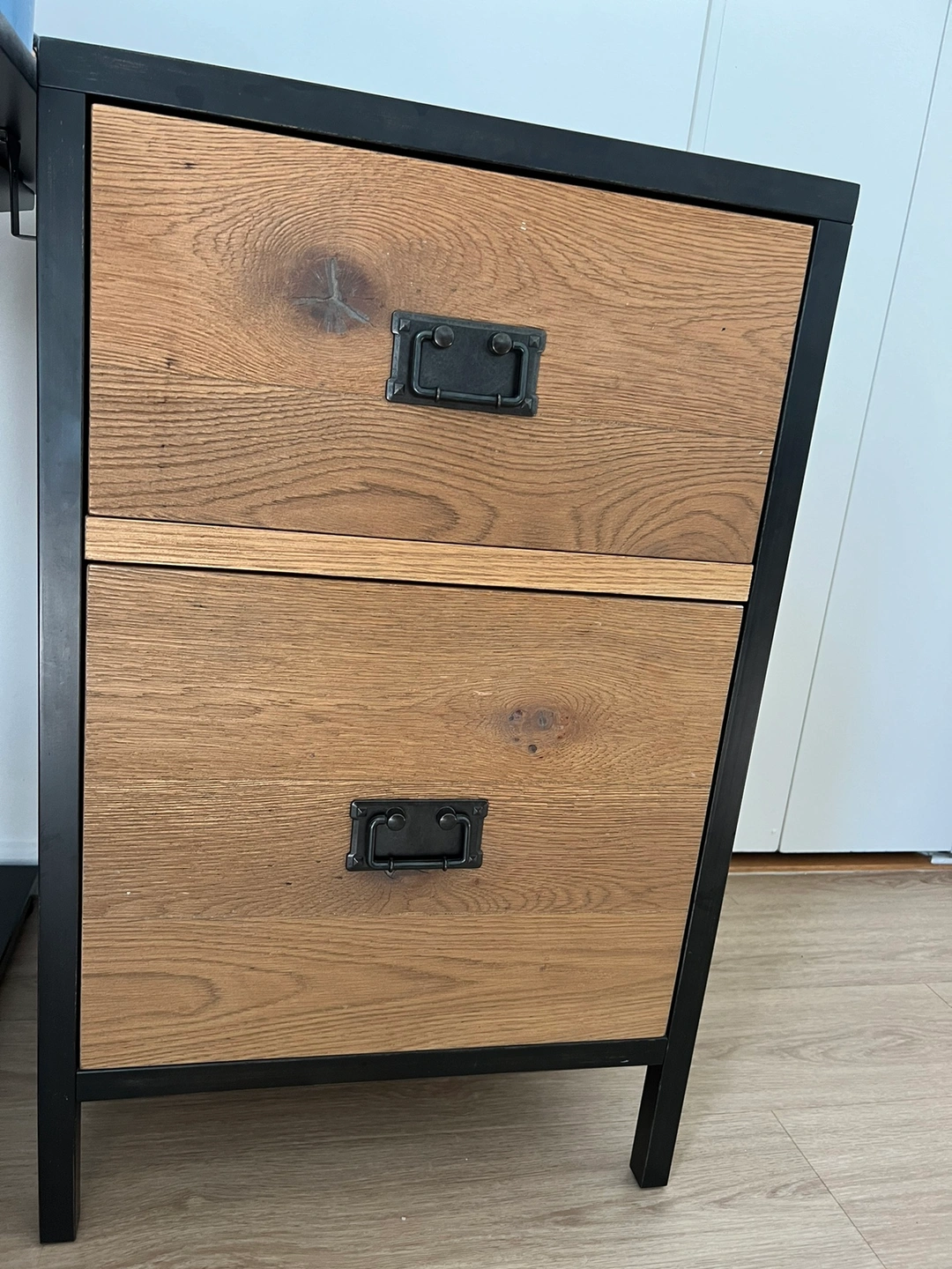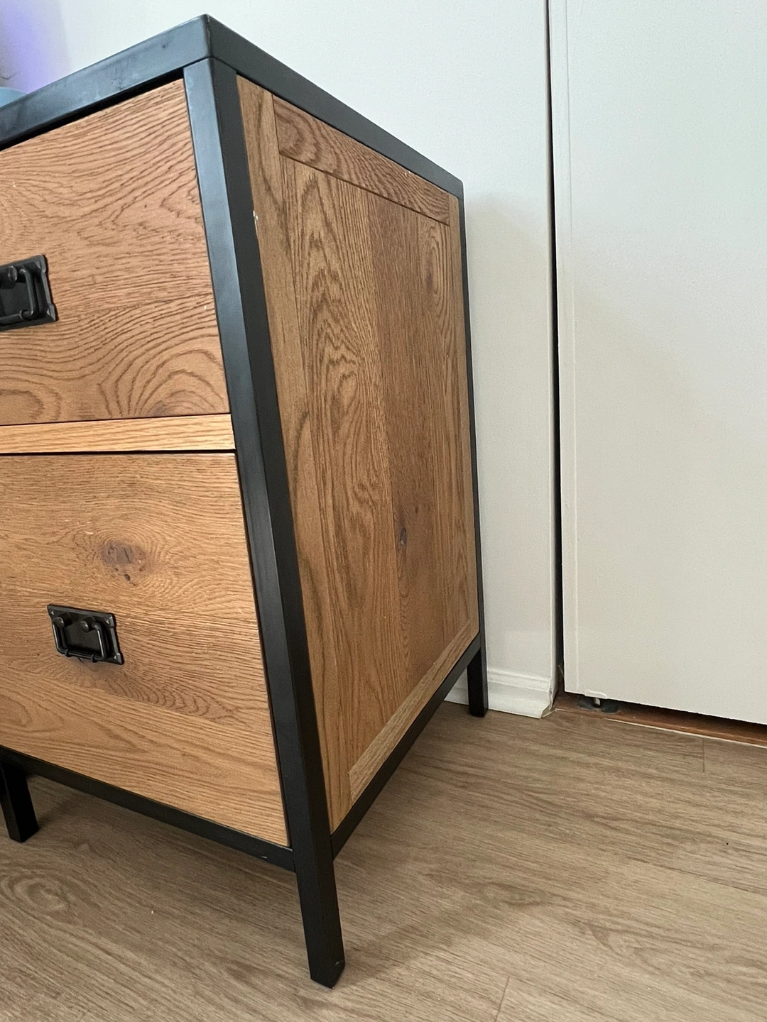 This is a two-drawer file cabinet that can be used as a storage chest or a nightstand or anything with a black metal frame and wooden drawers. The drawers have black metal handles. The chest is in good condition.