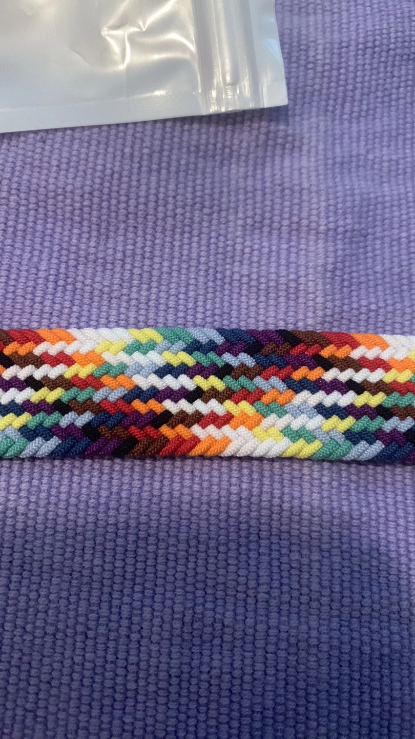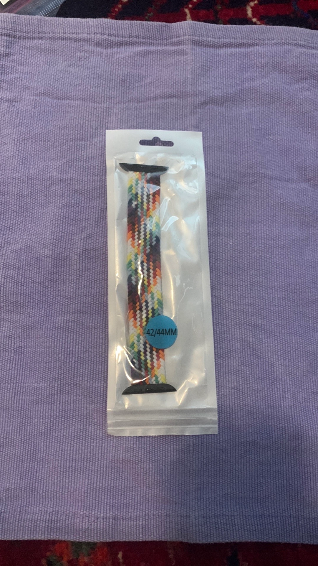 Colorful woven band with black metal connectors. Suitable for 42/44 MM Apple Watch. This is a stretchy band that can adjust to size.