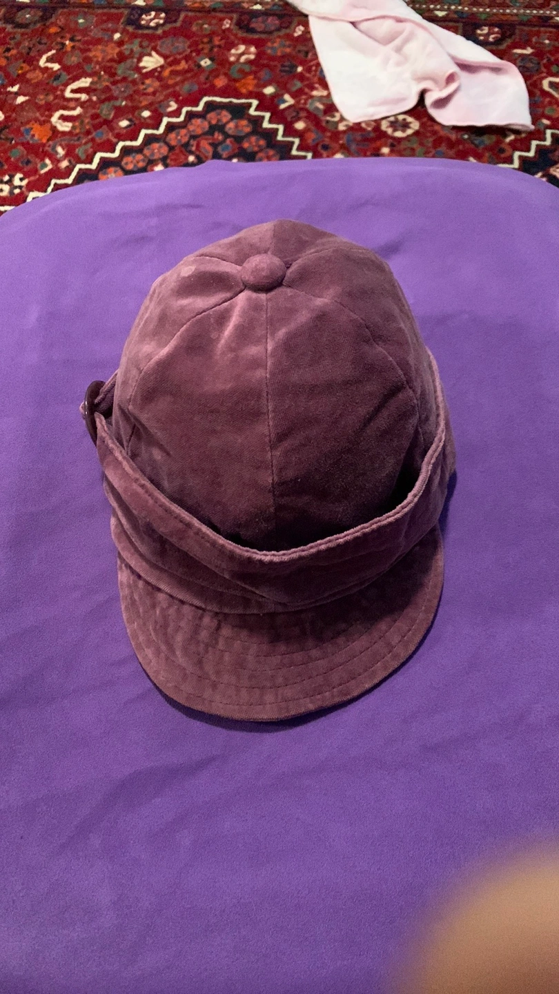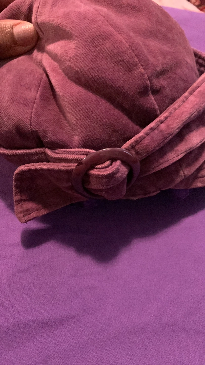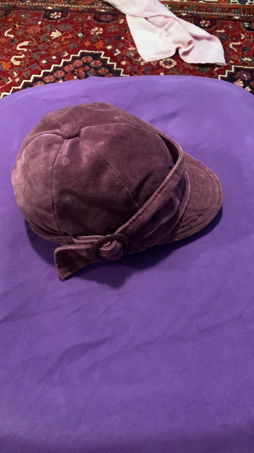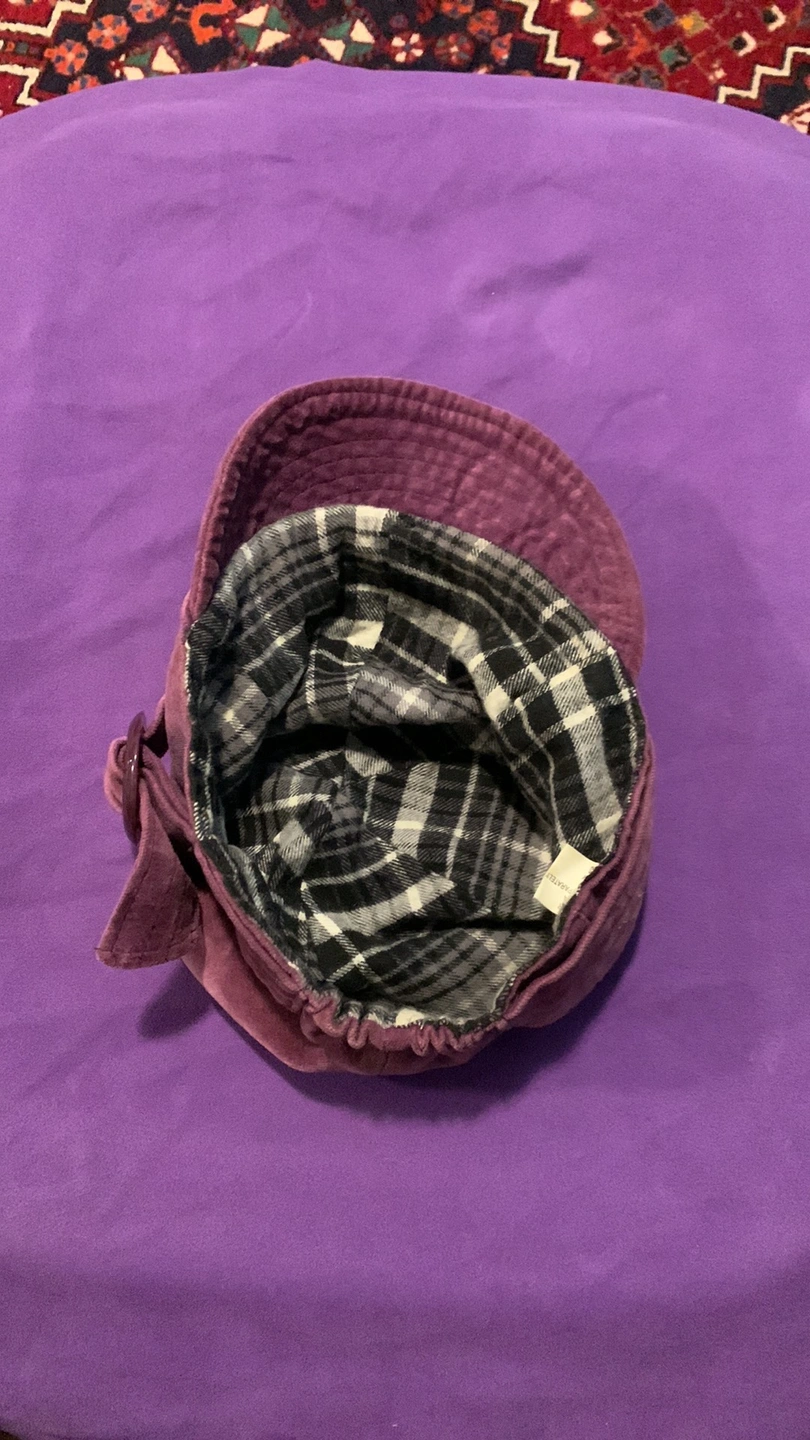 A soft purple velvet hat with a black and white plaid lining, a large buckle on the side and a round button on top. It’s a great fall hat.
