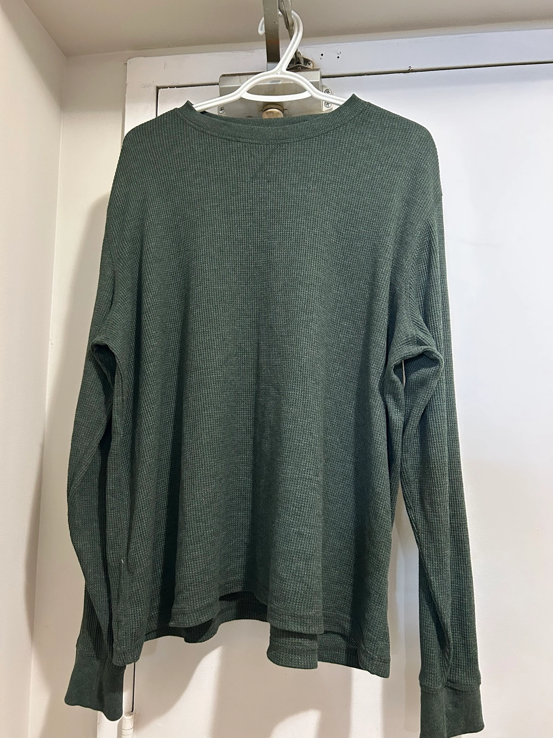 548Green long sleeve thermal shirt. Great for layering or wearing alone. The shirt has a waffle knit texture and is a comfortable fit. It is a great basic for any wardrobe.