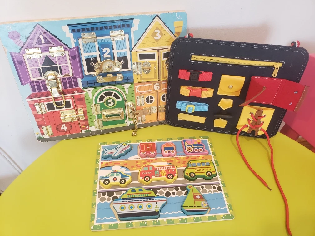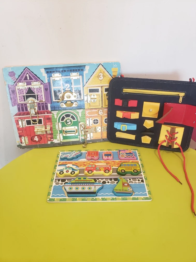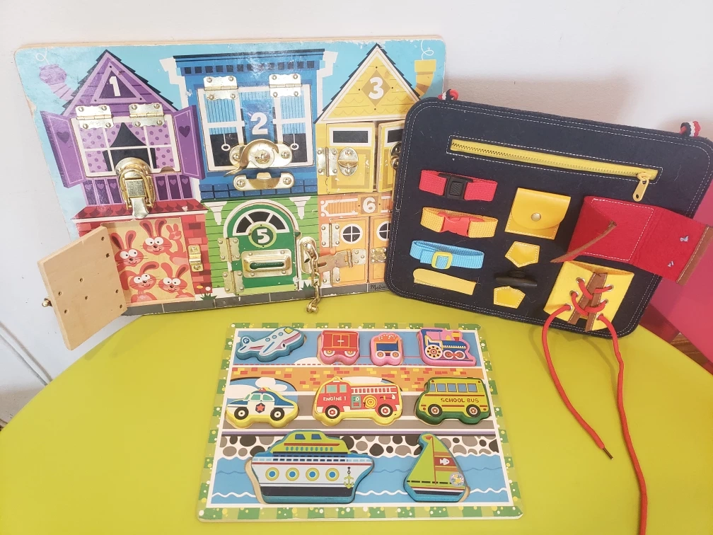 Set of three toddler busy boards. Includes a house with doors and latches, a fabric board with zippers, buckles, and laces, and a wooden board with vehicle shapes.