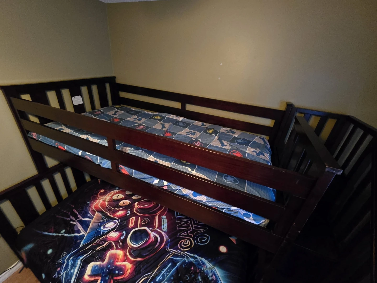 This sturdy dark wood bunk bed features a unique staircase with built-in storage drawers. It's designed to maximize space and offer a fun sleeping solution. The upper bunk has safety rails and fits a standard twin mattress. Bottom bunk fits a queen.