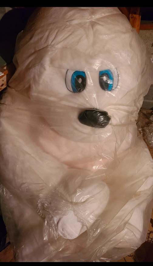 Giant white stuffed animal with blue eyes. The material feels soft and cuddly. The toy appears to have no tears or missing fur. It would make a great gift or decoration for any room.