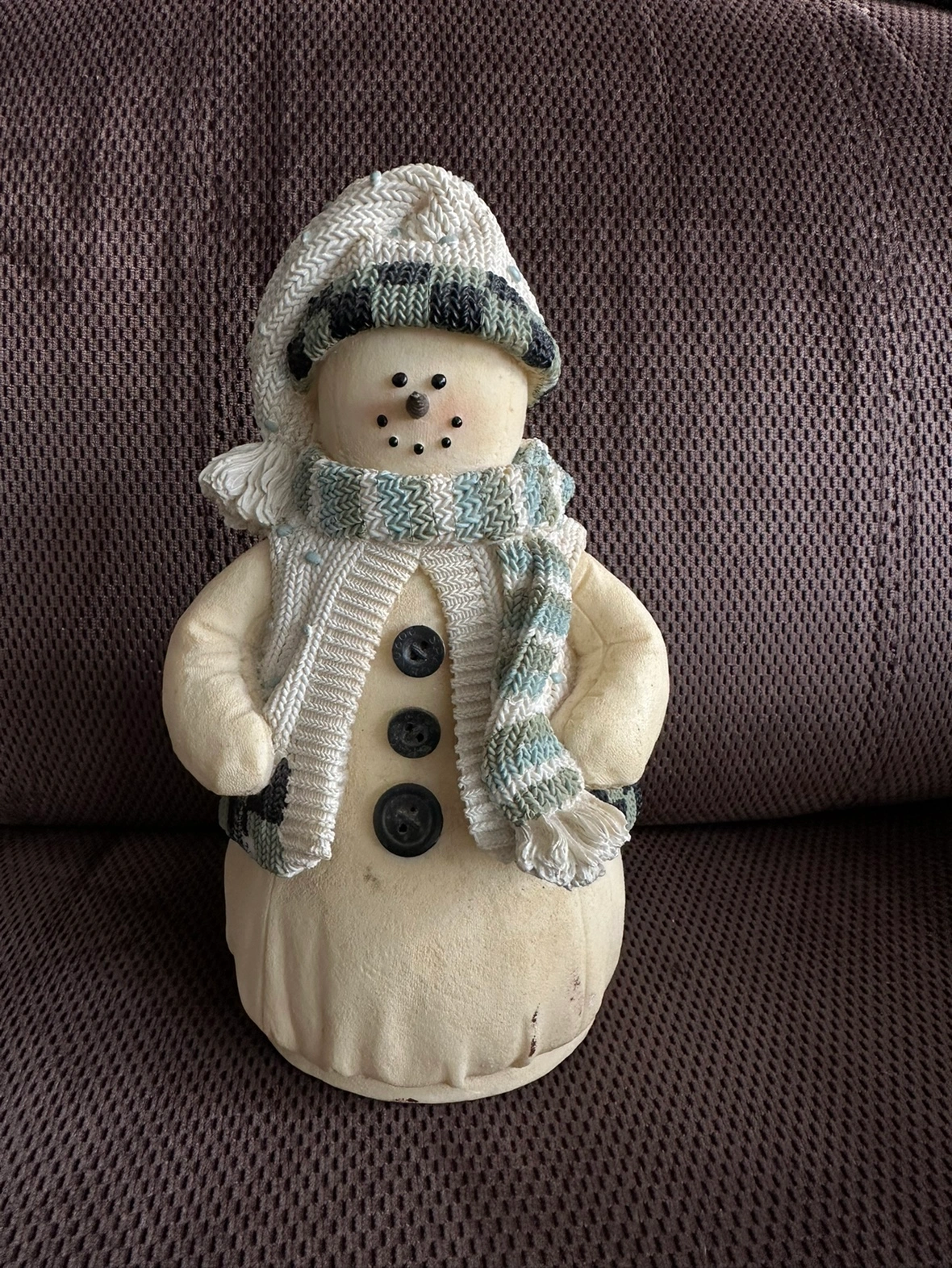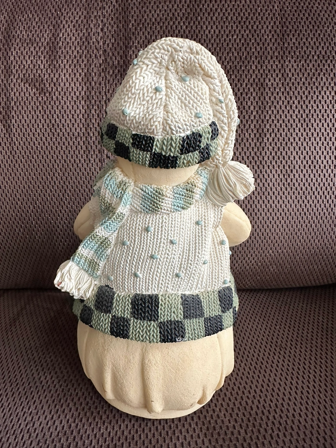 A musical figurine of a snowman with a knitted hat and scarf. The snowman is in a standing position and appears to be made of ceramic or resin. The figurine plays music when the key is turned. Some small marks on the body, no cracks and musical component works, smoke free home.