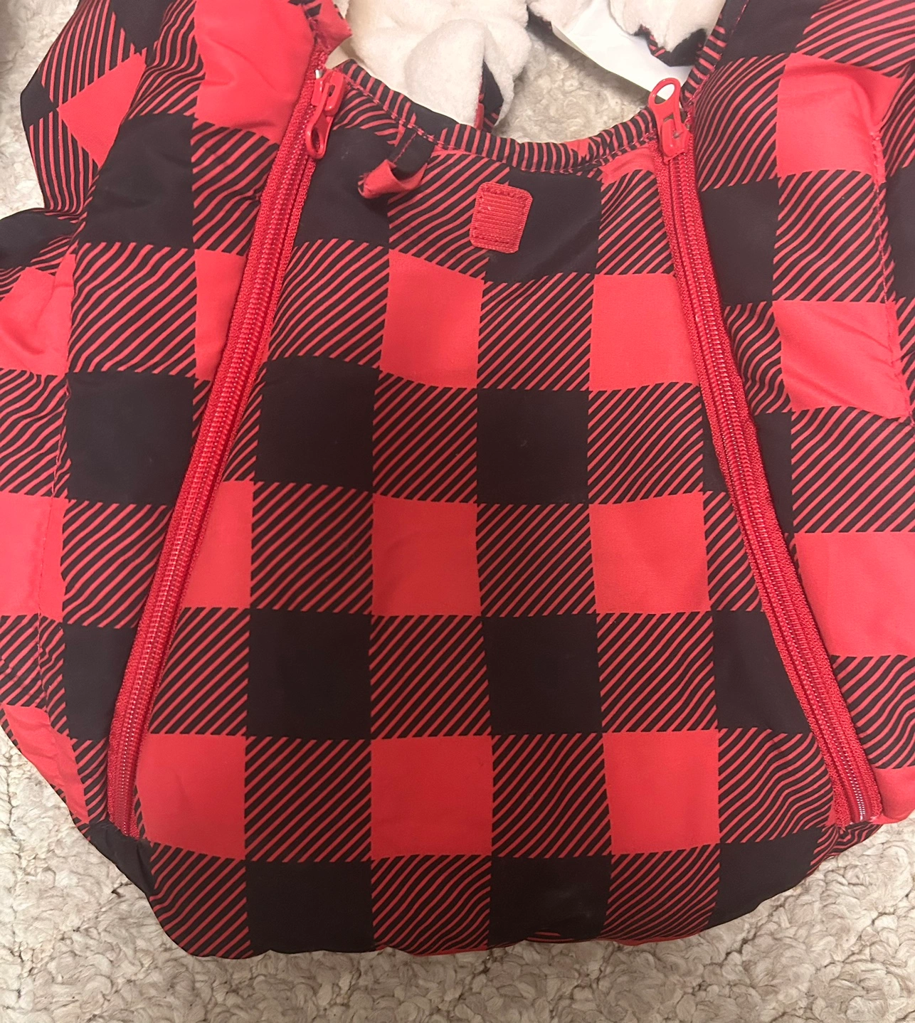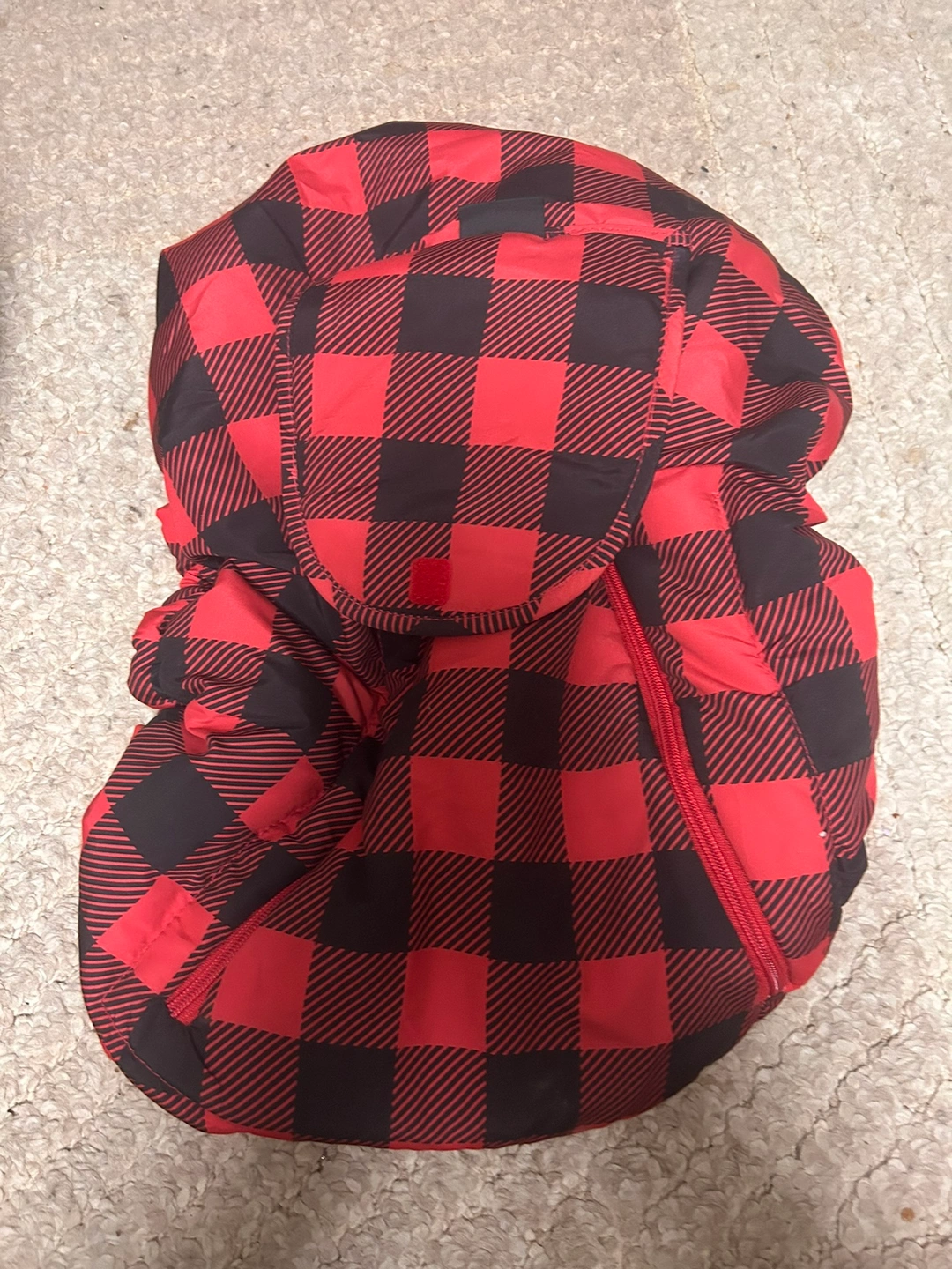 Red and black plaid car seat cover with a fleece lining. It zips up on both sides and has a face flap. For baby car seat use.
