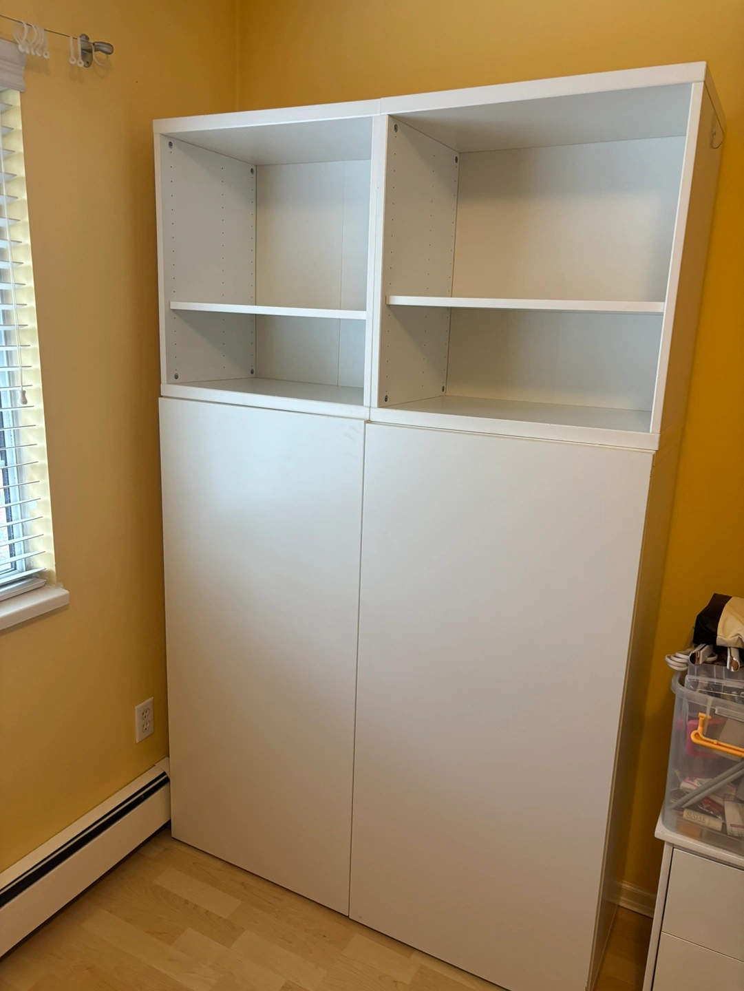 This shelving unit is made up of two sections, each with a shelf on top and a closed cabinet door below. The unit is white and has a modern design.