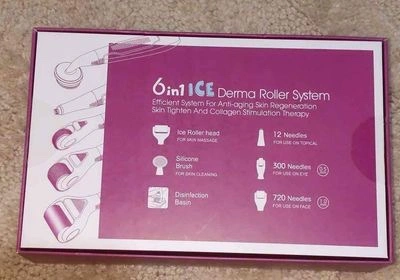 This derma roller system features 6 different tools including an ice roller head, a silicone brush, a derma roller with 12 needles, a derma roller with 300 needles, a derma roller with 720 needles, and a disinfection basin.