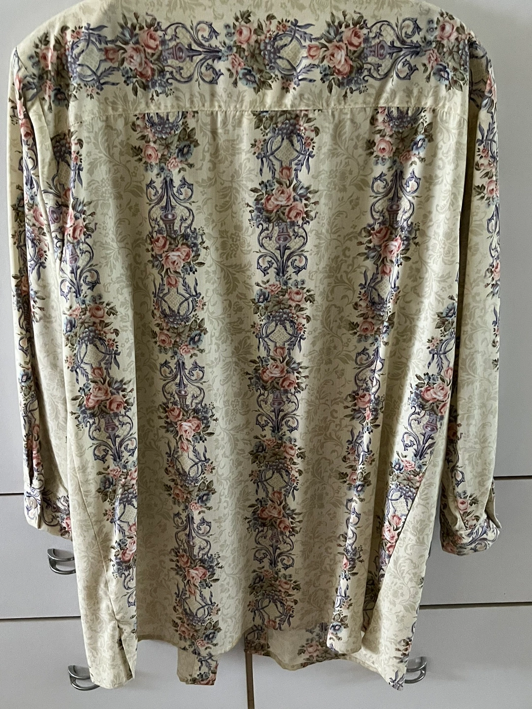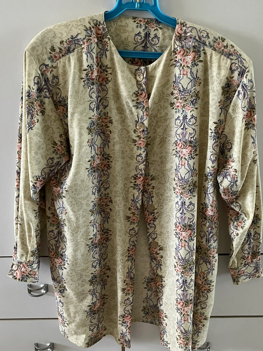 Long-sleeved blouse with a floral print. It features a button-up front and a round neckline.