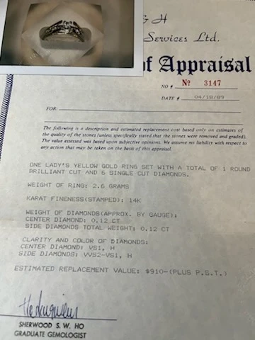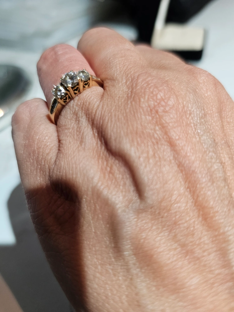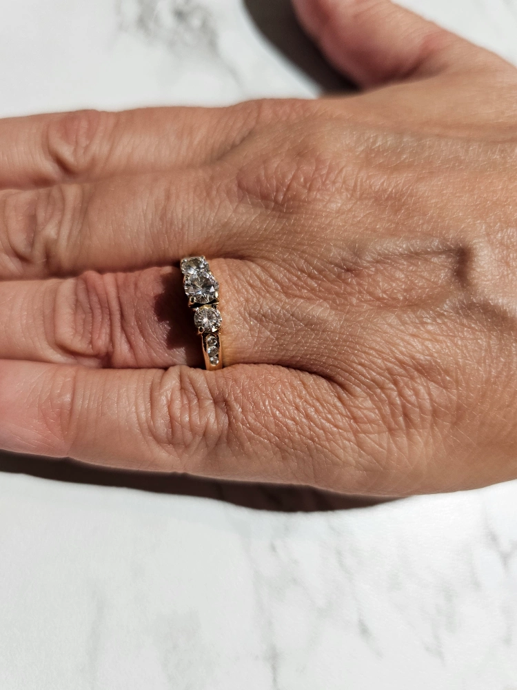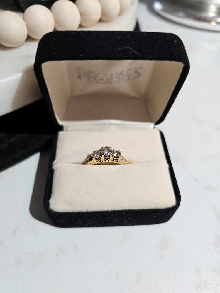 Three stone diamond ring in gold setting. Comes with a Peoples Jewellers ring box. Size 5.5