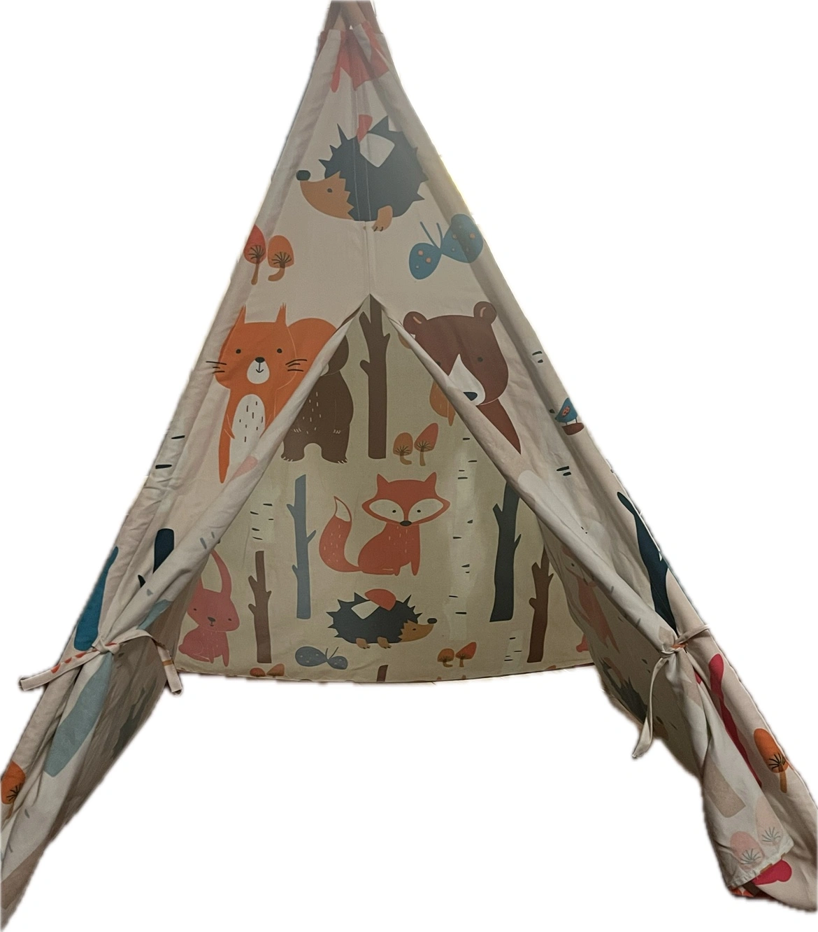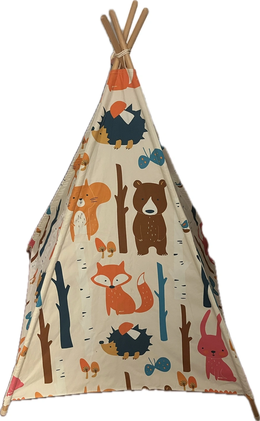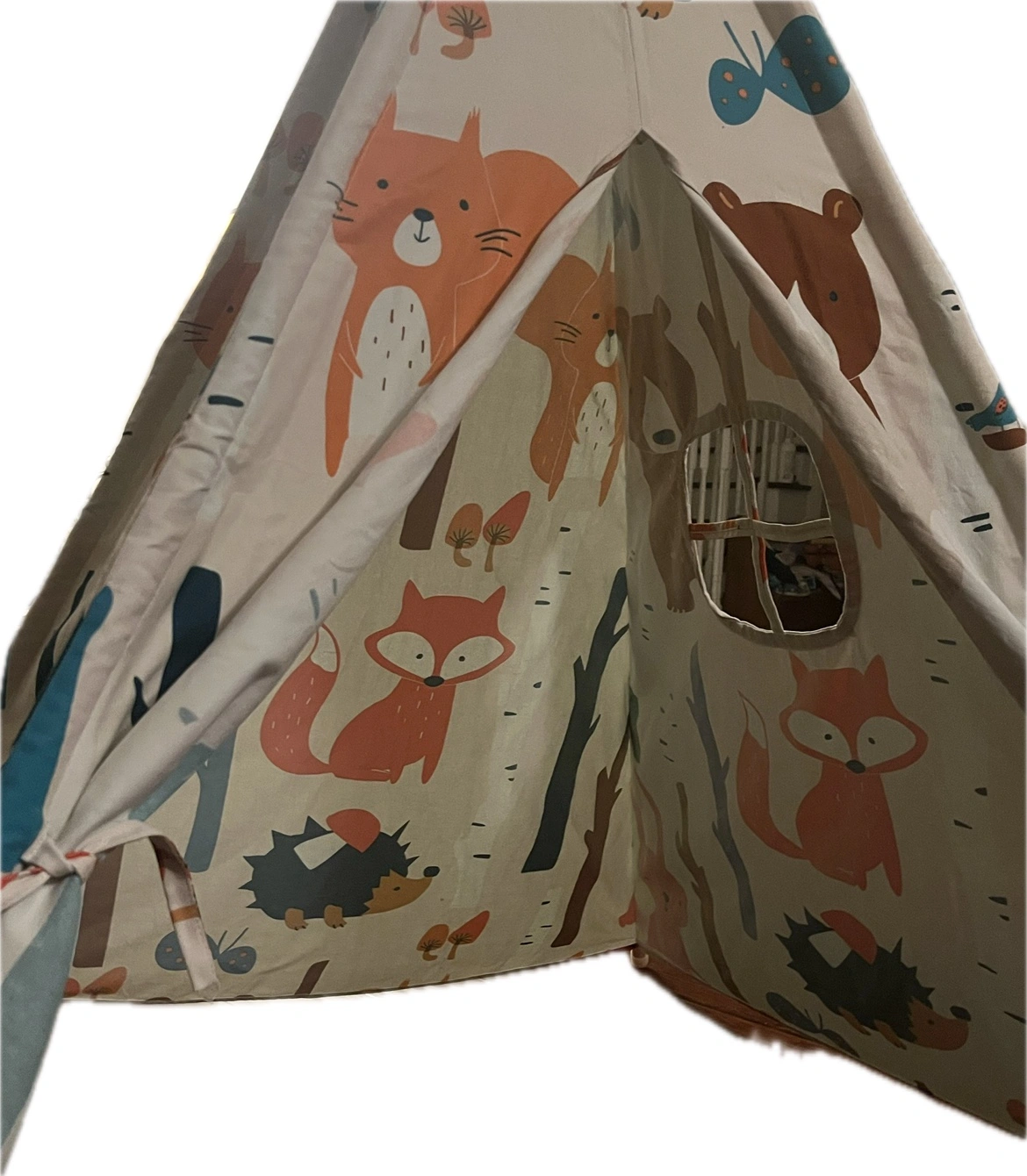 A fun and playful teepee tent perfect for any child's room. Features a woodland animal print with a roll up door. Comes with four poles for easy set up. Perfect for indoor or outdoor play.