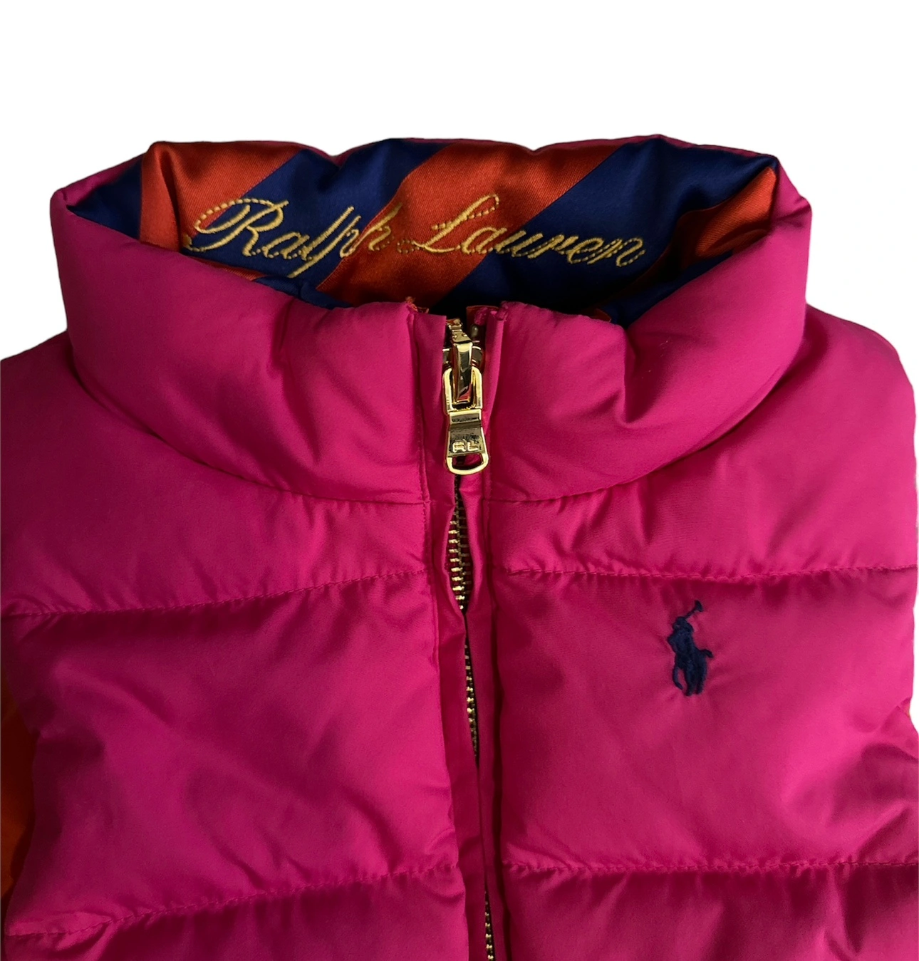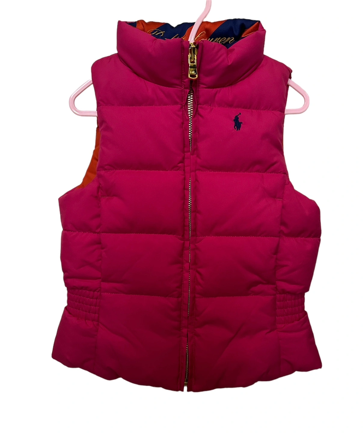A pink and orange reversible puffer vest with a gold zipper and embroidered polo player logo. The vest has a high collar and is reversible to a solid orange colour. It is in size small (4T) and has a cinched waist. Only flaw is a small dot on the back on orange side(not noticeable)
