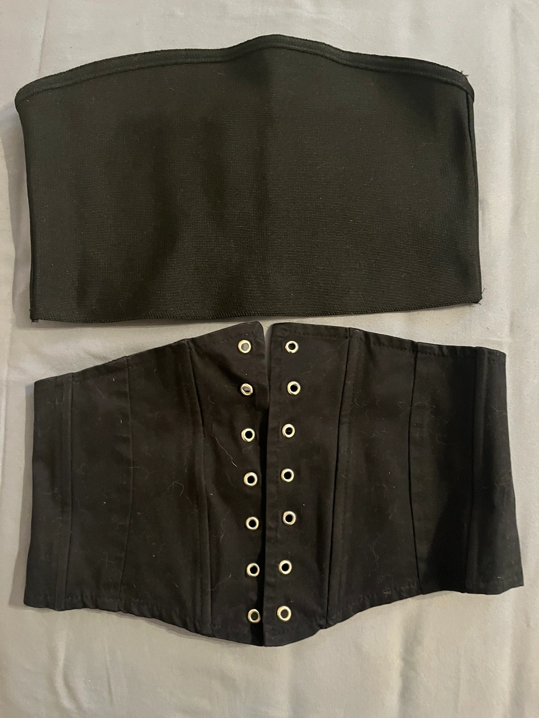 This set includes a strapless top and a corset with a zipper closure in the back. The corset has an adjustable lacing system with silver grommets. The top is a simple bandeau. Both pieces are black in colour. They are made from a stretchy fabric. Size XS. Both pieces are in excellent condition.