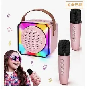83This karaoke machine comes with two microphones and has a built-in speaker with colourful lights. It is perfect for singing along to your favourite tunes.